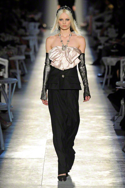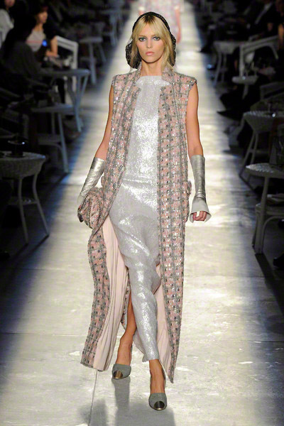 New Vintage, was the name of the haute couture collection Karl Lagerfeld presented yesterday. Because Vintage is soooo depressing Lagerfeld thinks. New Vintage is something to come, he states. Well, the clothes had a 1940’s line—broad shoulders, swingy coat, cape backs—in a color palette of black, gray, silver, and dusty pink that spoke of film noir interiors. The hair also had a forties flavor. The spine of the collection was suits, he paired them with sparkling legwear and wove silver through his “tweeds.”