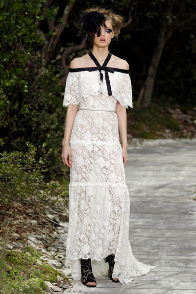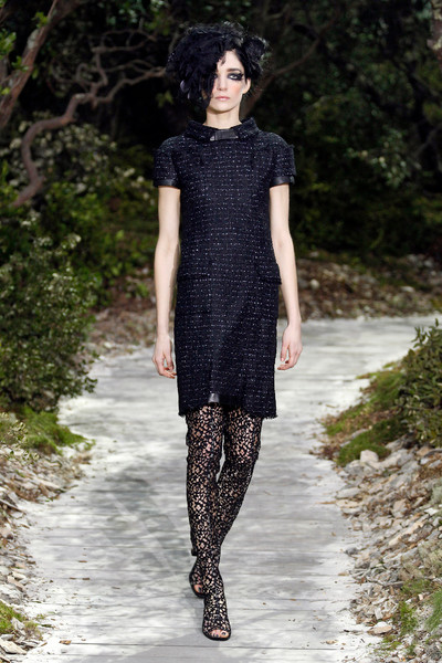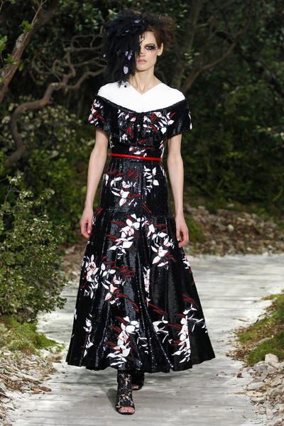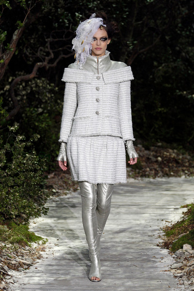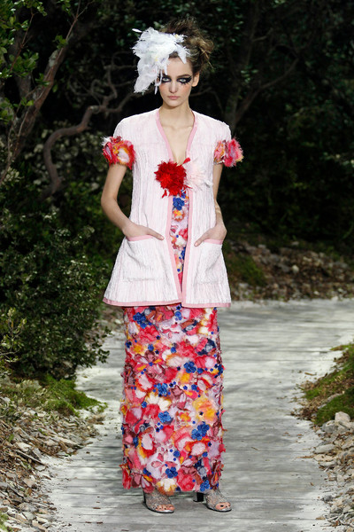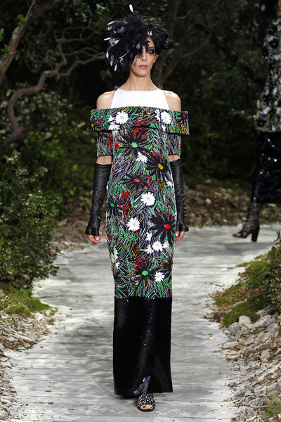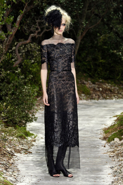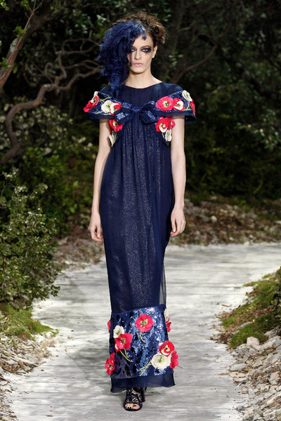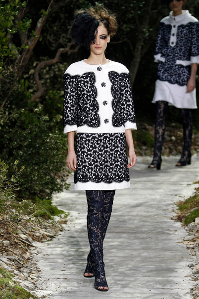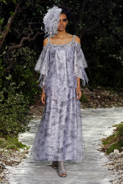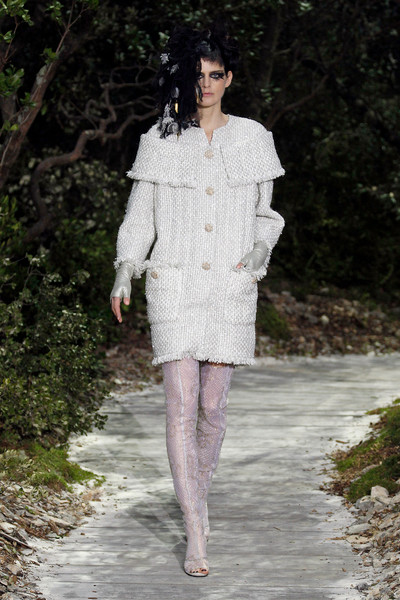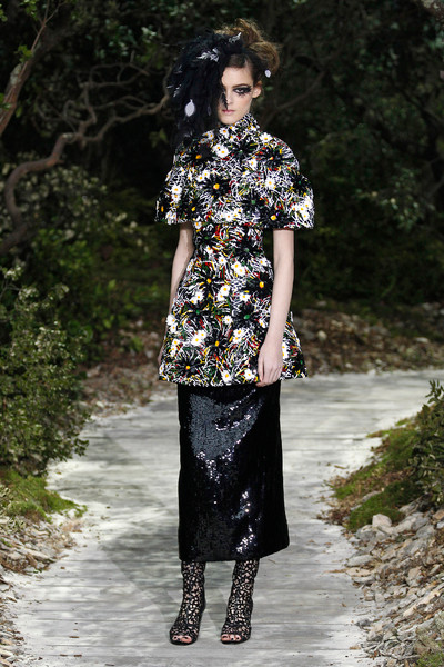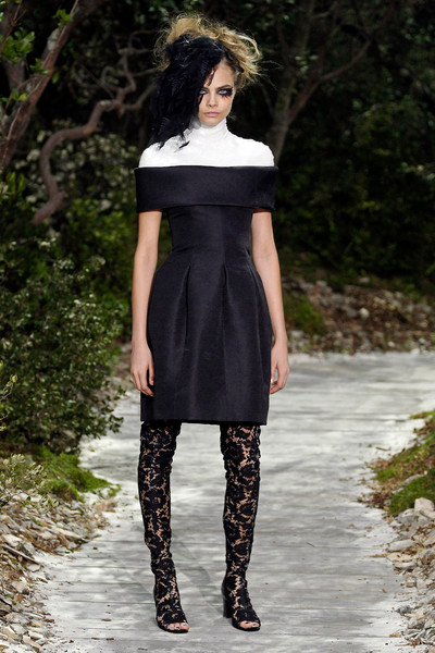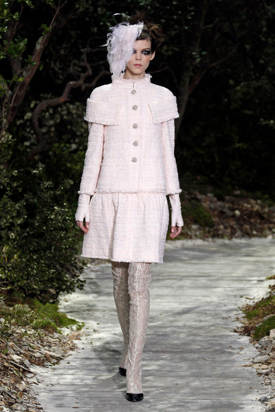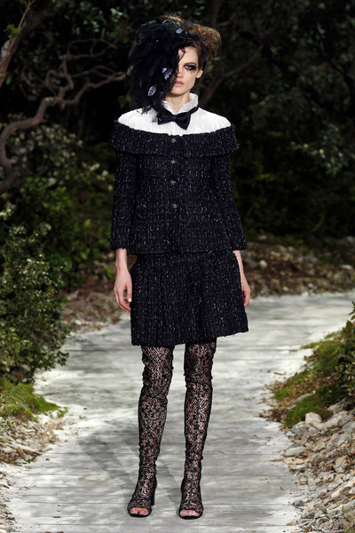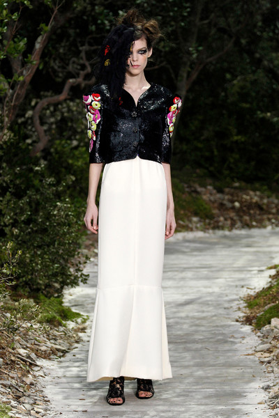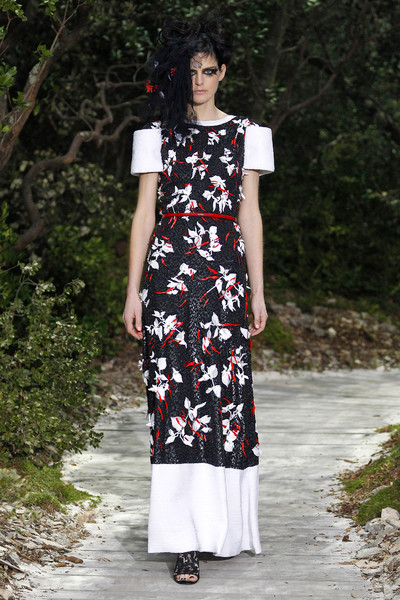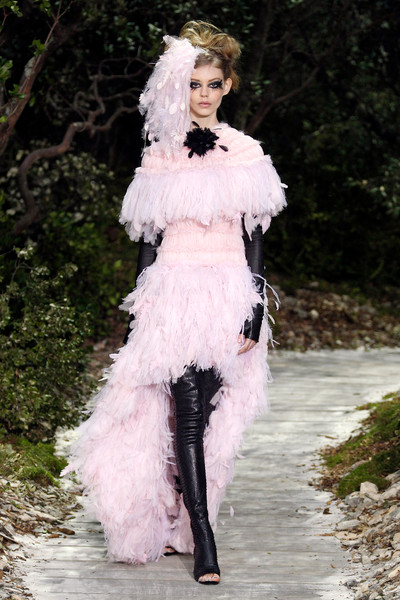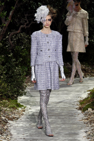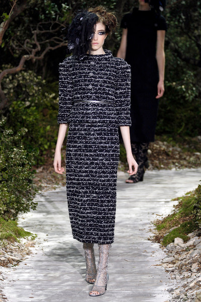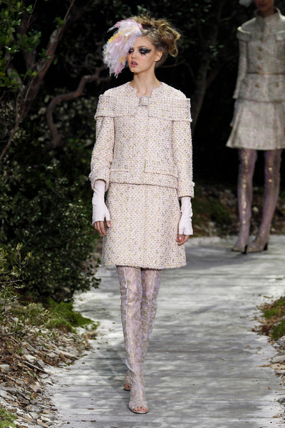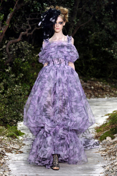 At Chanel couture the feeling was fairytale like, yet scary at the same time. Dressed in perfect light shaded lace ensembles Lagerfeld’s models walked his path through the green. Their eyes dark and decorated with feathers, their faces hidden behind large droopy headpieces. They were classy ladies dressed in playful volume skirts and ribbon tweeds jackets. And how chic were those over the knee lace boots?! After hemlines dropped a few inches (midcalf length) and Lagerfeld added color in form of floral embroideries, evening dresses appeared both chic and dramatic. Evening dresses and two wedding dresses at the end that might just include Lagerfeld’s thought on the momentarily much discussed gay marriage in France.