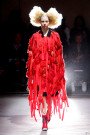 A sea of red everywhere we could look. Choosing roses and blood as a theme Rei Kawakuno decided to stick to one color of poppy red. Different textures, structured shapes and extraordinary silhouettes created enough variation in the collection though. Fabrics being shredded, fringed, slashed up and raw edged. This were not clothes designed just to look pretty or set trends in. The designs somehow breathed some of the difficult issues happening in the world right now. Prettiness versus chaos and violence, roses versus blood. Kawakuno gave us all something to think about and not just whether we’ll be sporting shorts or culottes next spring.