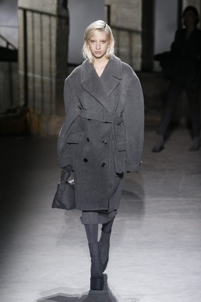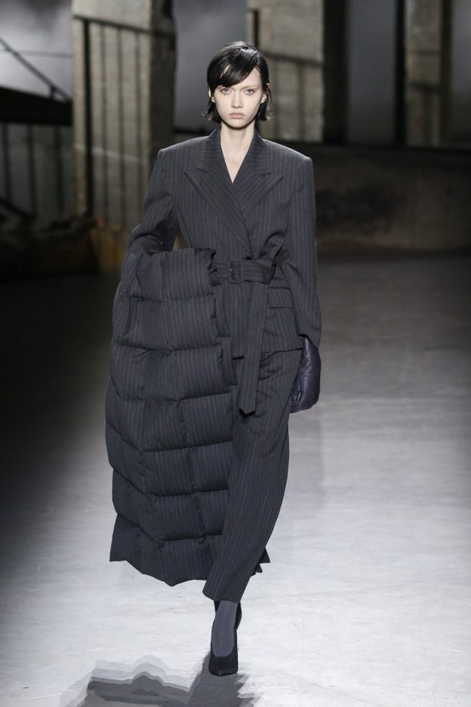 Dries Van Noten started off rather somber today. The first series of looks that appeared on the concrete runway at Palais de Tokyo were grey colored and pinstriped. Yet with looks the designer changed things up a bit and when we arrived at look #9 the office ready dresscode had made way for cocktail chic when Hannah Motler came on wearing a lilac satin dress with floral embroideries and chunky boots. Those flowers, as it turned out, were inspired by flowers growing in Dries van Noten’s own actual garden. He and his team had been doing some gardening as a video at the end of the show showed us. And so those flowers weren’t picture perfect but had imperfections too. From lilac we slowly moved on to other pastel shades, like ice blue, mint green, powdery pink and light yellow. Shades that worked beautifully (Dries is a master in creating the most gorgeous palettes) with the much more vibrant orange and purple. When mustard and brown shades were introduced all looks had a strong fall sense about them. Dresses were extremely loose fitting and had high necks. A trench and some satin robe inspired coats were cinched at the waist but other than that the silhouette for fw2019 was loose, fluid and roomy. There were enormous floral printed puffers to survive the strongest of winters. As some sheer looks, like an icy blue number with red leave embroidered added to the festive and elegant part of the collection. A finale of partly sparkling dresses (worn with golden gloves and silver boots) and a few tuxedo suits completed the fw picture. Puffer scarf under your right arm and your good to go.