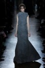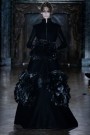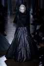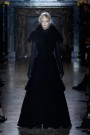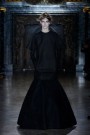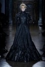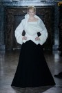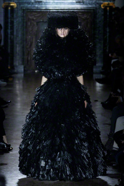 Inspired by the Asgarda tribe, a group of Ukrain warrior women who segregate themselves from the everyday world to become strong and independent the designs indeed seemed to empower as the models wearing them looked tough and confident. They appeared feminine and Victorian in Pugh’s long and lean silhouettes (in shades of black, white, grey and blue) with raised necklines and dramatic floor sweeping skirts. Structured leather and gold embroidered silk looked both Gothic, romantic and futuristic. Simple T-shirt inspired tops with chic pockets (a reference to the Asgarda women) added a new minimalistic approach to Pugh’s line. They formed quite the oppossite of the series of black finale dresses, which got a little more drama with every look. Who would have thought trash bags from a one pound shop could look this impressive?