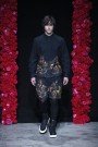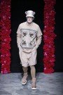 He showed many different versions of a wide short, worn with laced boots, which we doubt many men will want to wear. Rottweiler printed sweaters were combined with checked blouses and many of the jackets had black leather part.