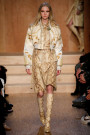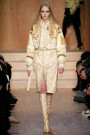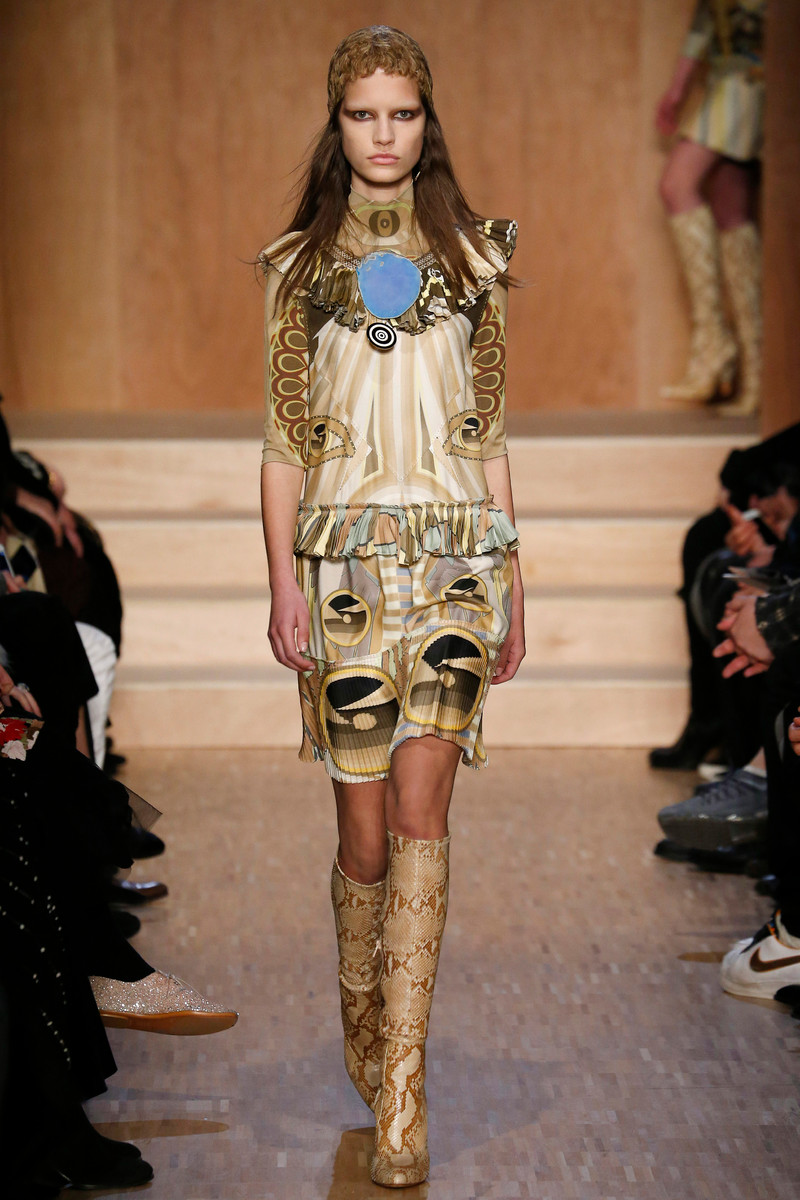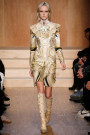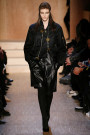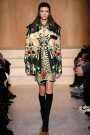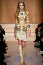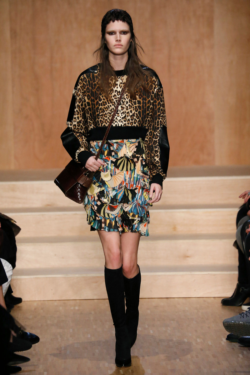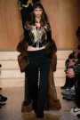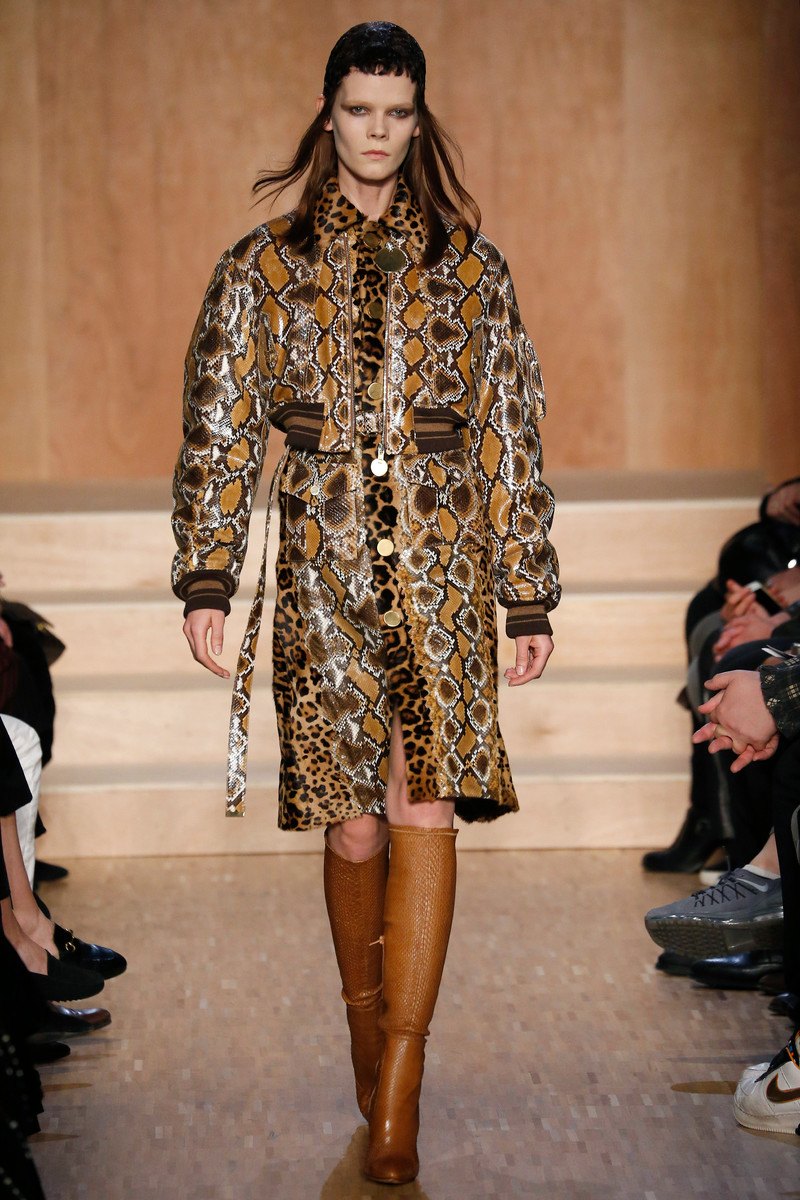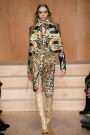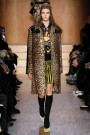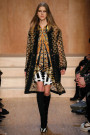 Carreau du Temple, the show venue at which Riccardo Tisci presented his earliest collection, brought us all together for Givenchy on Sunday night. For fall he came up with variety of psychedelic meets animalistic as well as Egypt inspired with a touch of military. Busy printed mid length dresses paired with generously cut officer’s coats and jackets and worn with just below the knee pump/boots. Fur lining and leather patches (like a green fur lining on a golden jacket and some black snakeskin patches on a number of all black looks) were a returning thing. Tweed suits were alternated with oversized shorts. And light lace and transparency had just as much a place in this collection as that heavy snakeskin-leopard lined number (which looked stunning) towards the end. Within the all natural color palette one bright shaded leather metallic jacket and even a cheerful paisley print made their way onto the runway. Proof that for fall/winter anything goes if you ask Tisci. Therefor not the strongest, most cohesive collection, but it included some mindblowing looks nonetheless.
