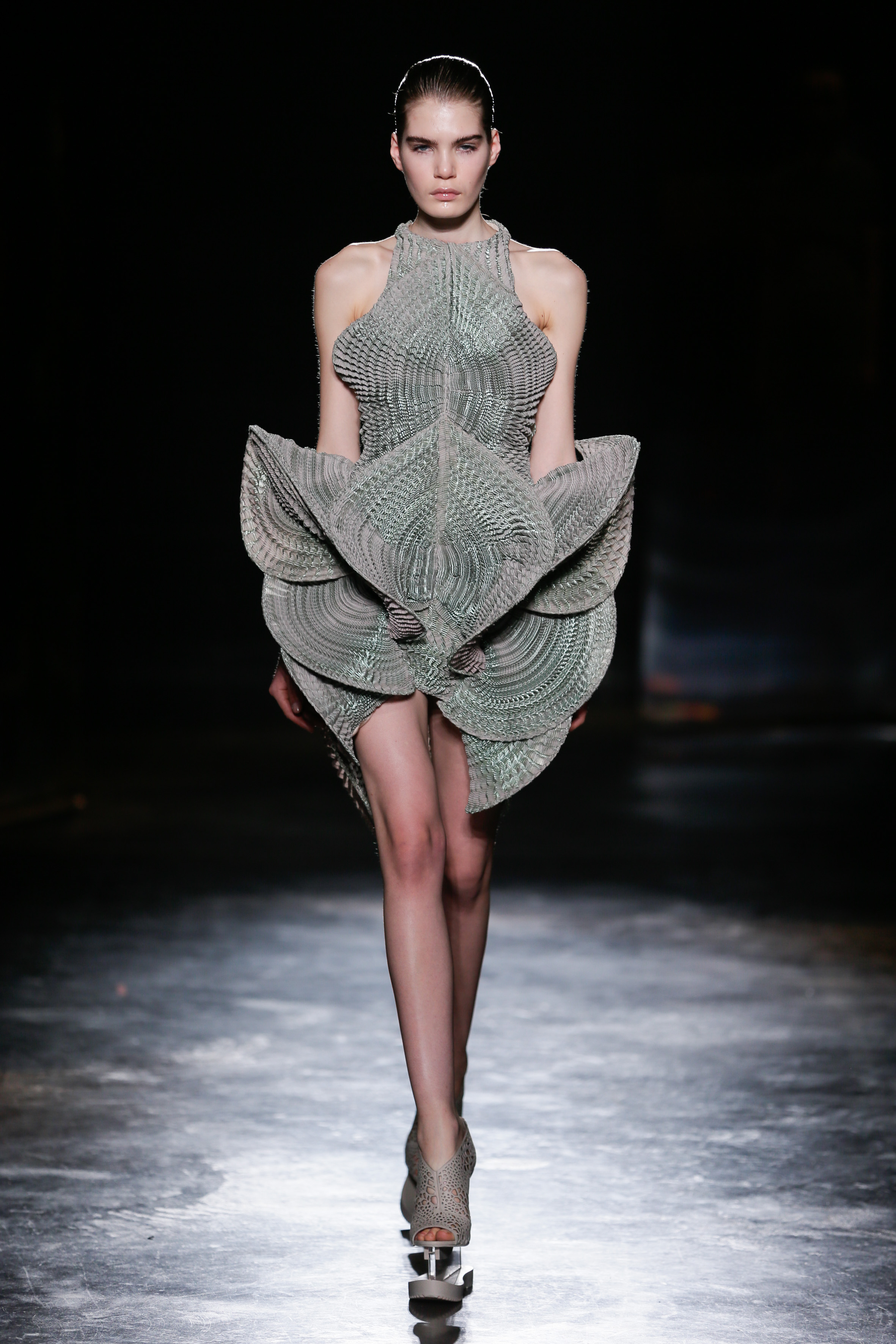 Fashion wise Iris used two different design technique, coming up with laser cut lucid looks (for which she collaborated with Philip Beesley) that are connected with translucent flexible tubes, creating a glistering bubble-like exoskeleton around the wearer’s body and phantom dresses, created made with a super light tulle to which iridescent stripes are fused, shimmering the silhouette illusory. Fashion forward as Iris is, she once again worked with on some 3D pieces, creating a dress stitched from 5,000 3D printed elements (a true work of art). Silhouettes were voluminous and feminine, the color palette a range of nudes, green and grey. And even if you leave out all of the above, forget that source of inspiration, put aside those futuristic techniques, you were simply looking at a selection of absolute stunning designs.