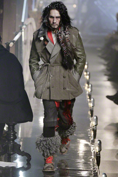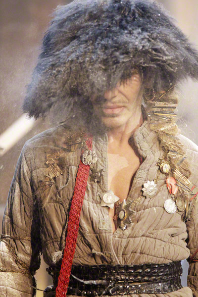 With his fallcollection 2011 John Galliano tried to tell the story of balletdancer Rudolph Nurejev: his struggles, triumphs and artistry. Of course he studied the life of the great dancer thoroughly and tried to translate every part of it even his idea of hope, discipline , dreams and the way he fled Russia. The show started with a pack of Russian emigres amidst a flurry of snowflakes dressed in heavy layers of second hand overcoats and with all their belongings packed at their back. Further on the show recounted Nurejev’s jet setting years in the Sixties, the torturing rehearsals in studios and finally beautiful, glamorous stage-costumes with Tatar-elements.