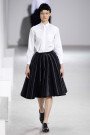 The story Junya Watanabe was trying to tell was that of algorithmic folds. The result: incredible shapes crafted out of the basic and commonplace, such as starched white shirts, cropped tailored black pants, capes, moto jackets and T-shirt dresses. Beginning with a plain white starched shirt and full, shiny black skirt in rounded pleats, Watanabe quickly built up the silhouettes into sculptures topped with exaggerated symmetrical headgear that made the models look vaguely like chess pieces. Skirts and capes came in precise honeycomb accordion folds that encased the body, some stiff, some structured but with a springy, elastic movement. A loose, lean jumpsuit had a spiky shrug around the shoulders.