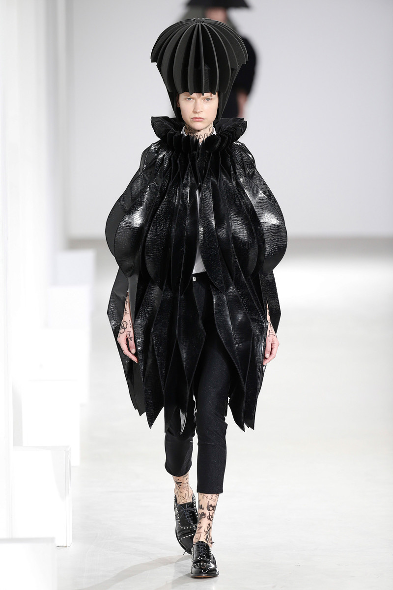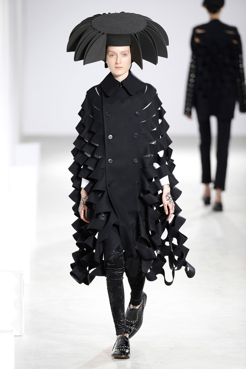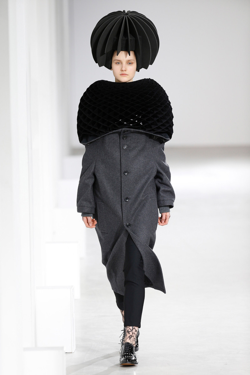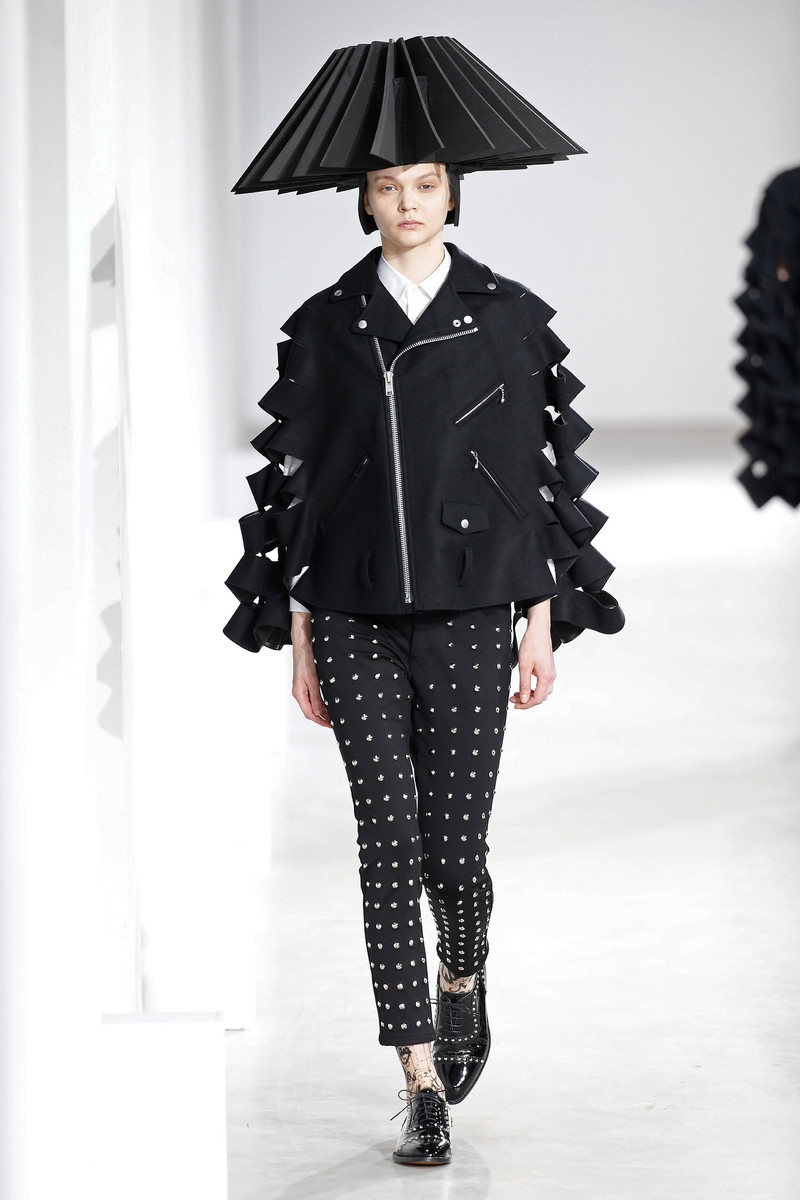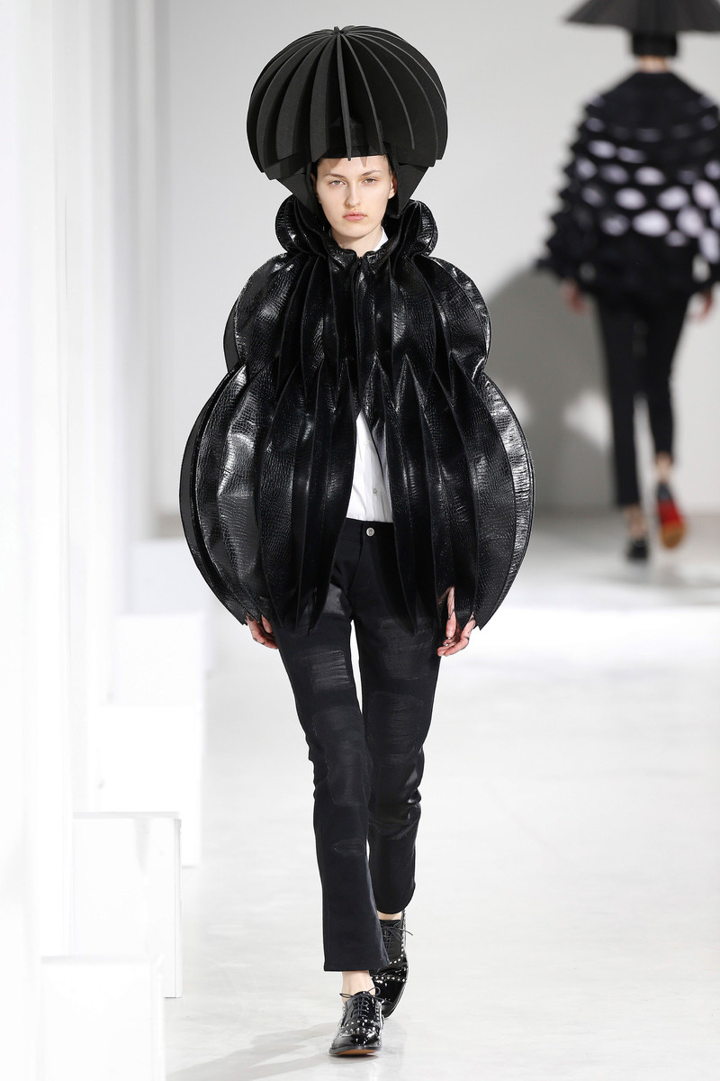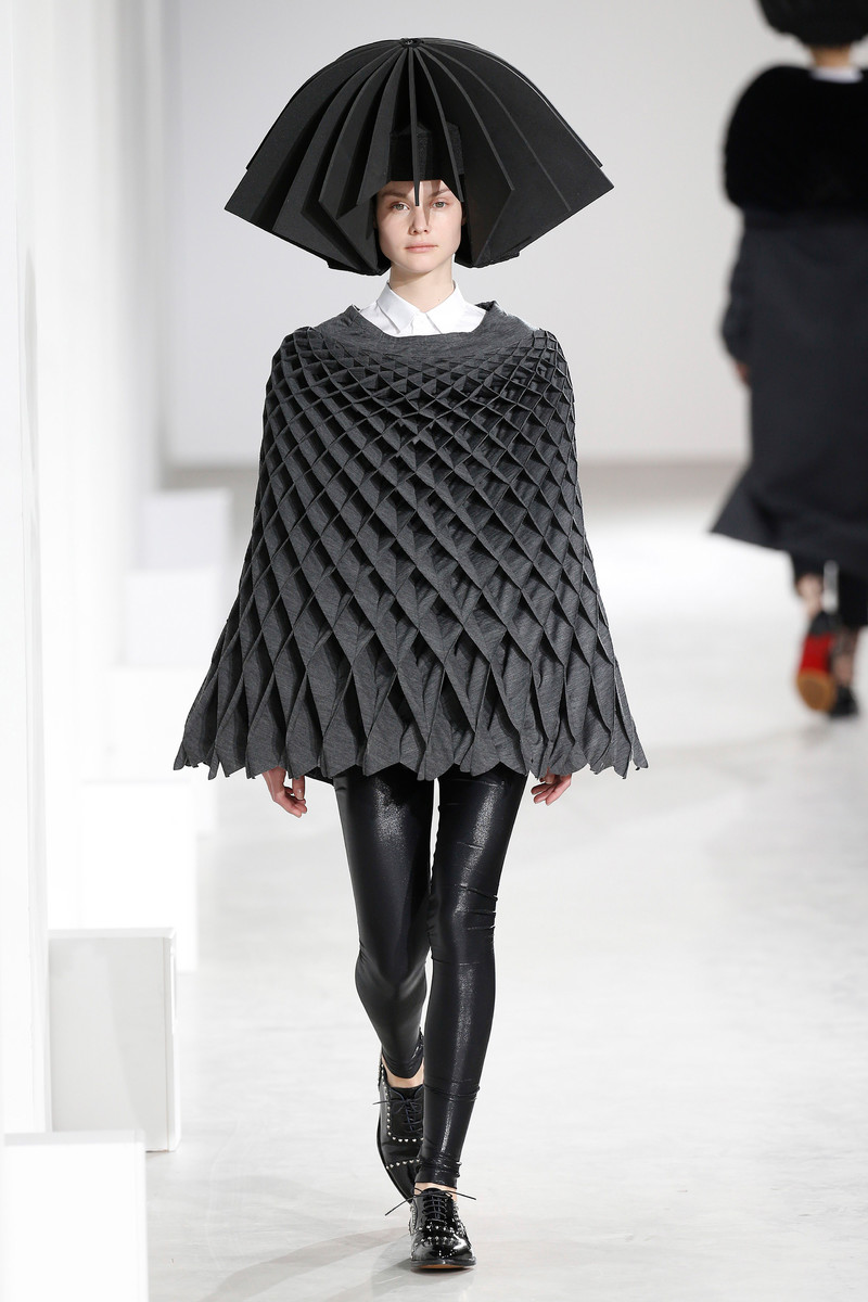 The story Junya Watanabe was trying to tell was that of algorithmic folds. The result: incredible shapes crafted out of the basic and commonplace, such as starched white shirts, cropped tailored black pants, capes, moto jackets and T-shirt dresses. Beginning with a plain white starched shirt and full, shiny black skirt in rounded pleats, Watanabe quickly built up the silhouettes into sculptures topped with exaggerated symmetrical headgear that made the models look vaguely like chess pieces. Skirts and capes came in precise honeycomb accordion folds that encased the body, some stiff, some structured but with a springy, elastic movement. A loose, lean jumpsuit had a spiky shrug around the shoulders.