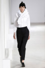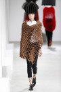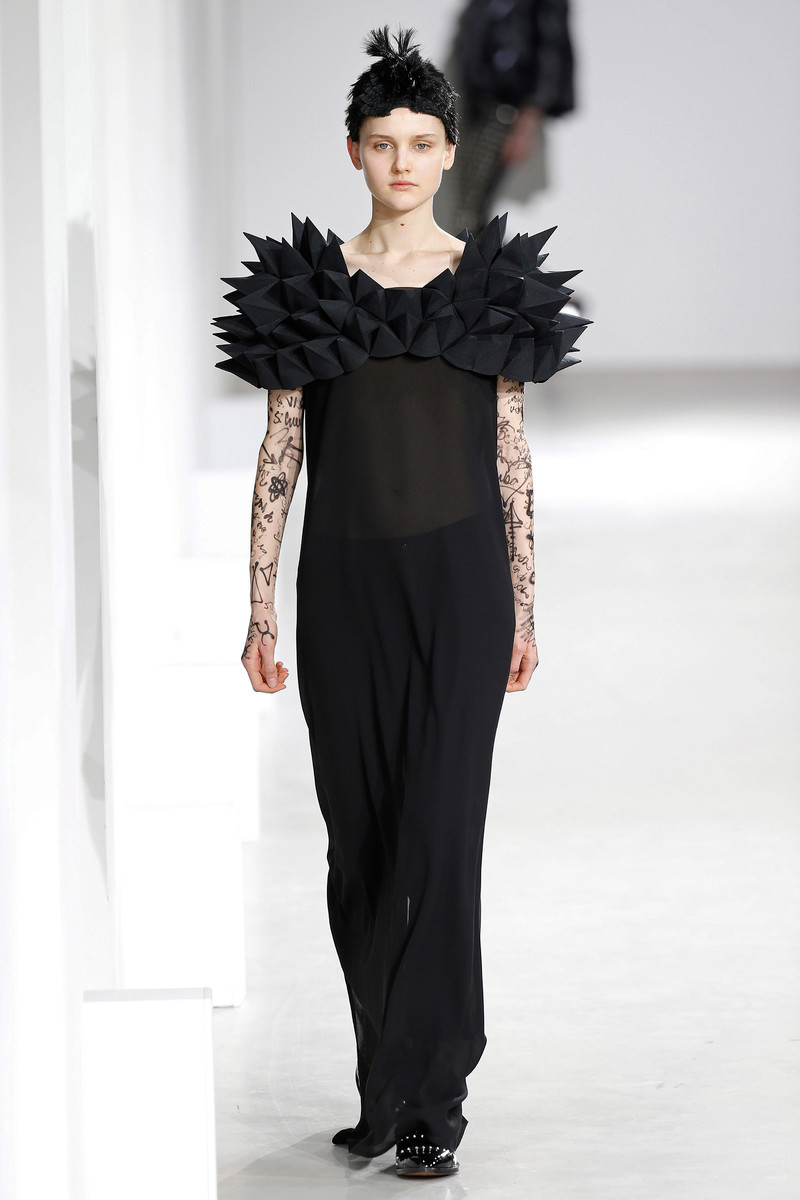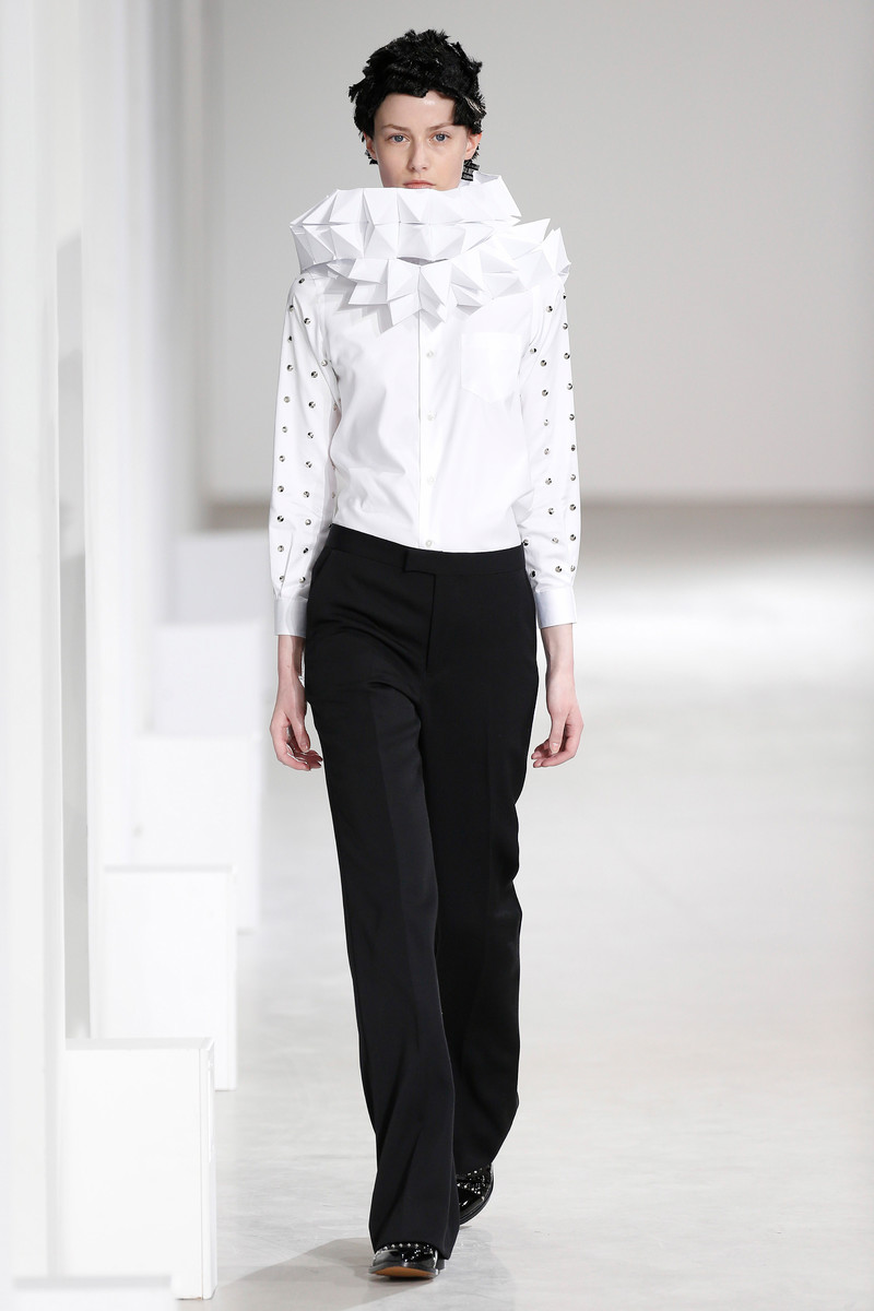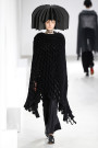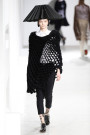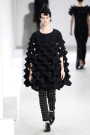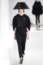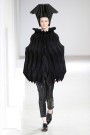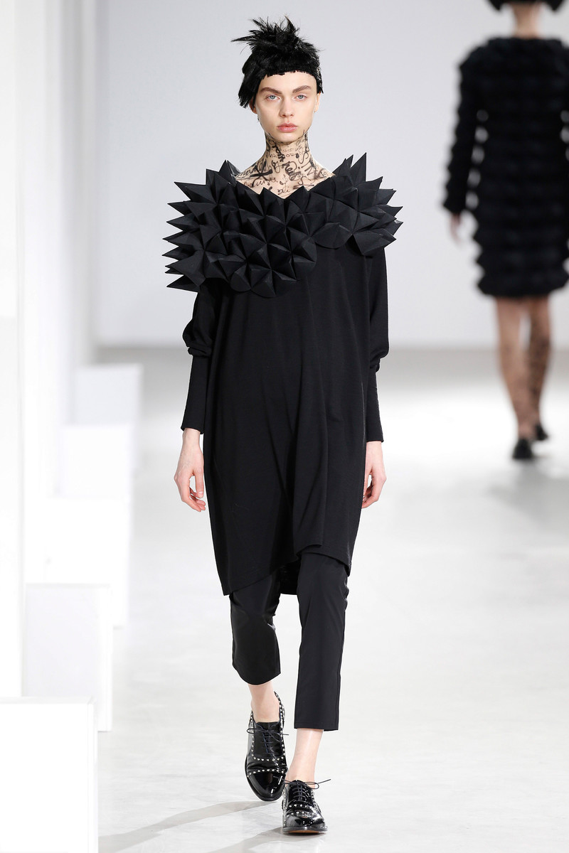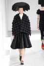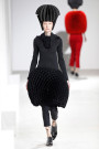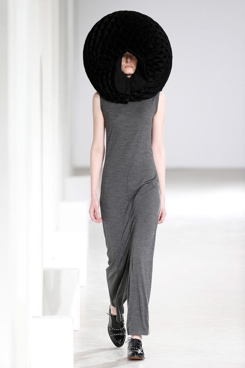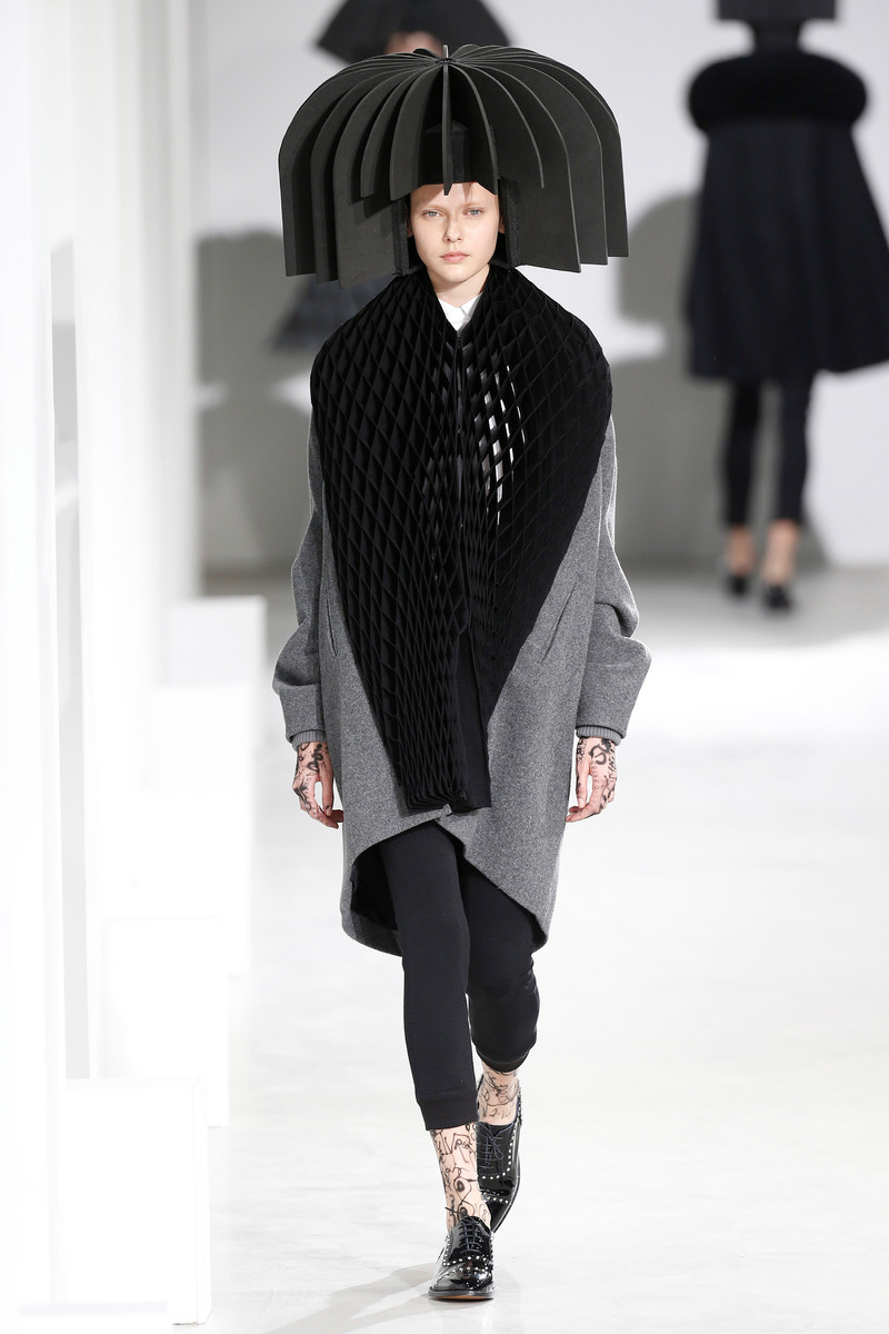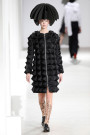 The story Junya Watanabe was trying to tell was that of algorithmic folds. The result: incredible shapes crafted out of the basic and commonplace, such as starched white shirts, cropped tailored black pants, capes, moto jackets and T-shirt dresses. Beginning with a plain white starched shirt and full, shiny black skirt in rounded pleats, Watanabe quickly built up the silhouettes into sculptures topped with exaggerated symmetrical headgear that made the models look vaguely like chess pieces. Skirts and capes came in precise honeycomb accordion folds that encased the body, some stiff, some structured but with a springy, elastic movement. A loose, lean jumpsuit had a spiky shrug around the shoulders.