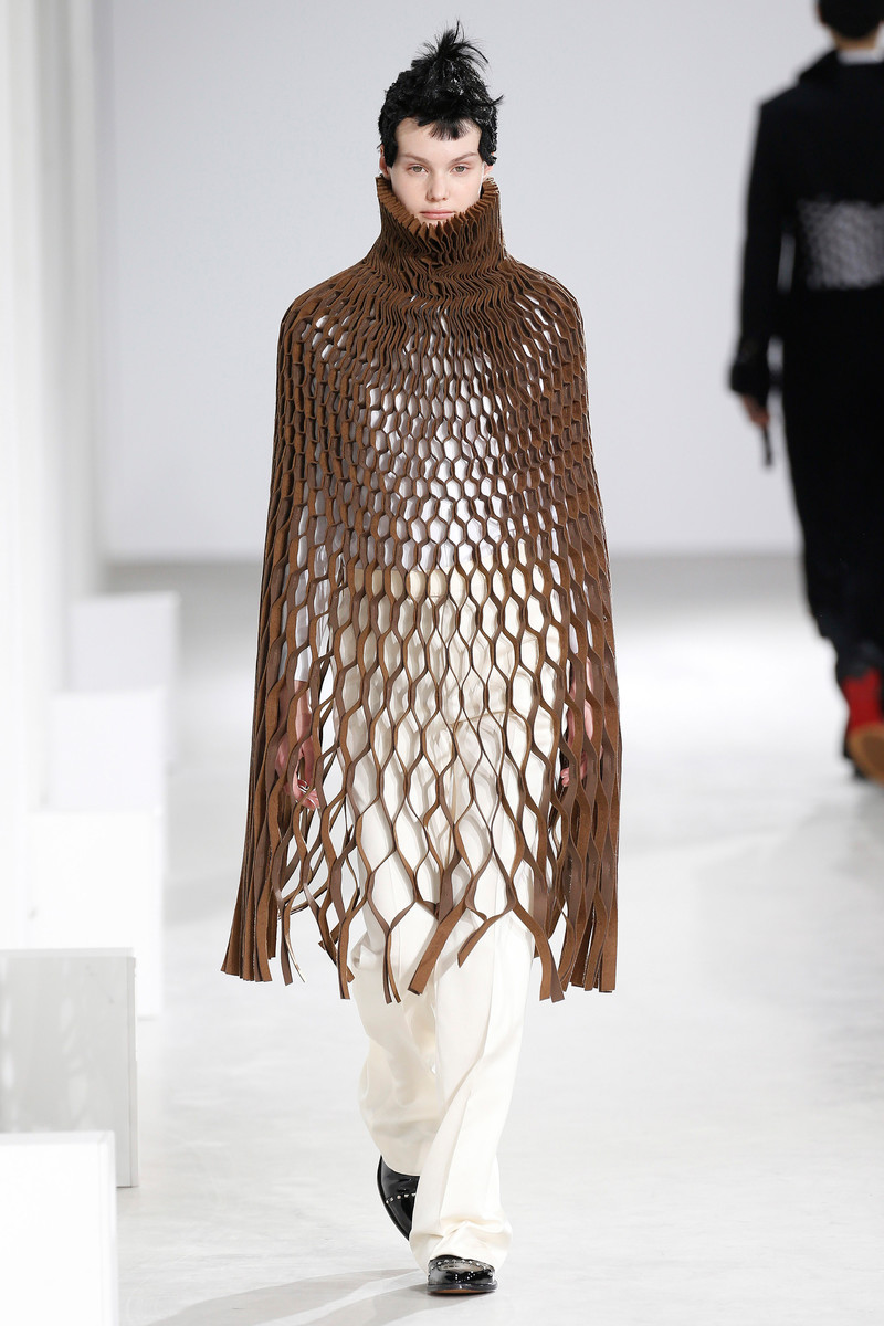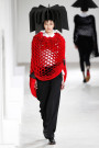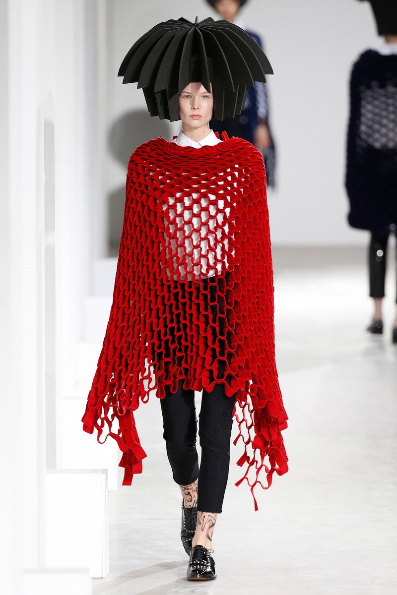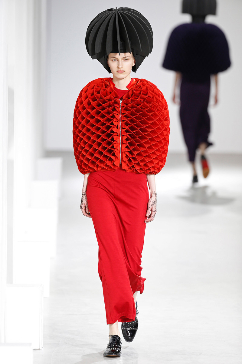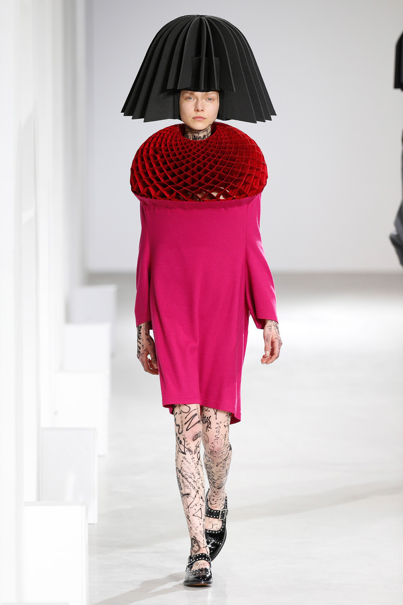 Most of the clothes would satisfy conceptual fashion geeks and retailers alike. But some of it was just for fun: The round, red honeycomb neckline of a hot-pink dress looked like a modern geometric ruff; an even bigger version of it on a purple look had the shape of a grand, perfectly pruned topiary.