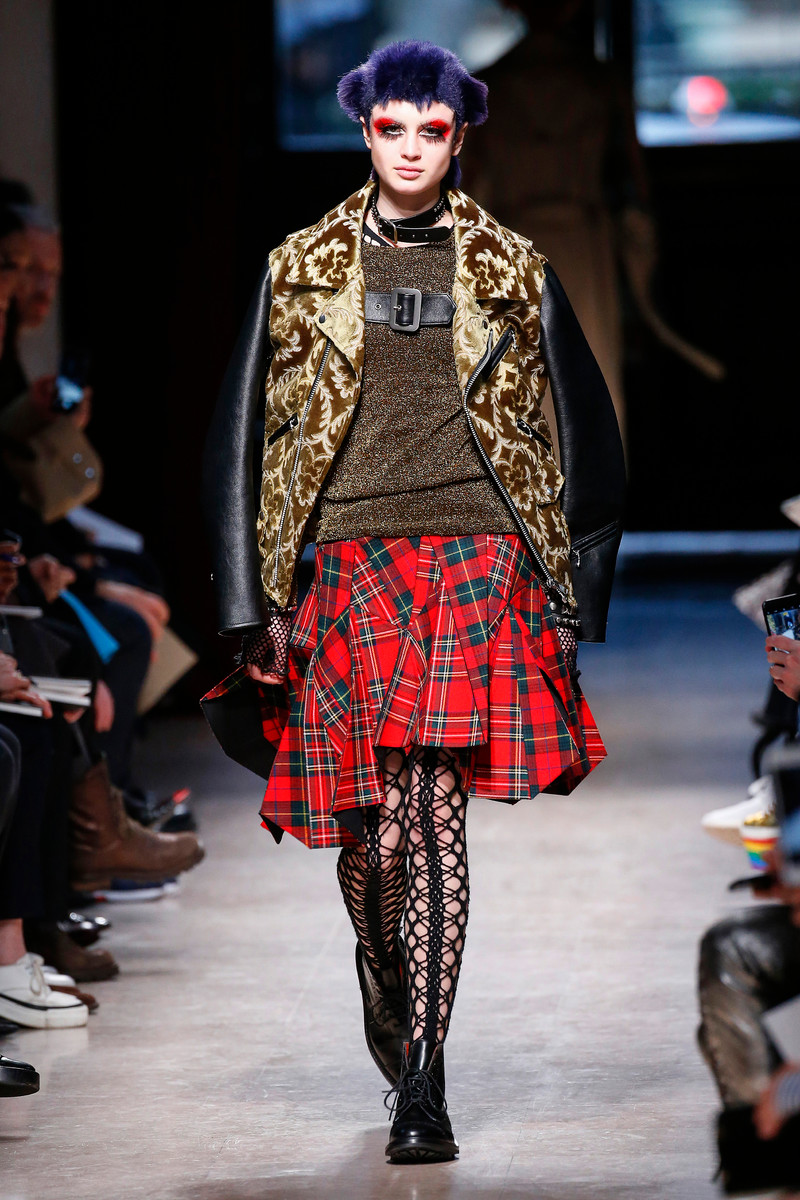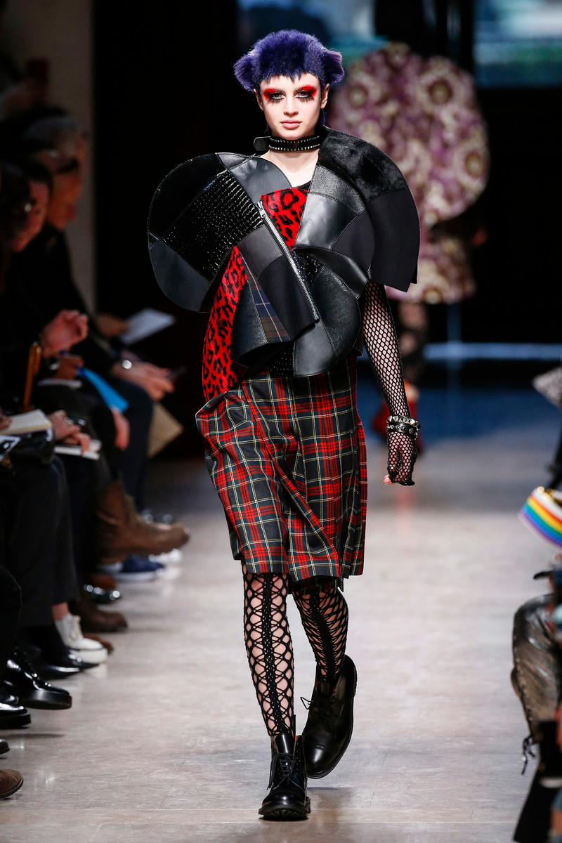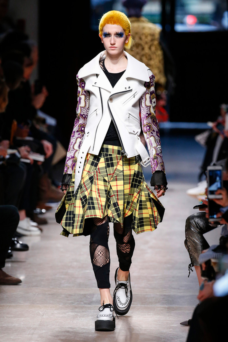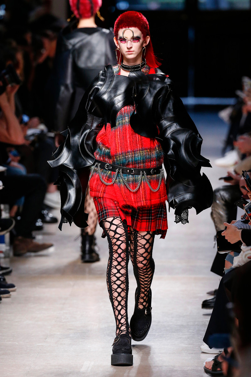 Junya Watanabe likes the ounk-era and this time het drew inspiration from the source: London. His punks were dressed in electric yellow and red plaids that were patchworked with black leather, sequins, traditional tailoring fabrics, a host of floral and jacquard upholstery plus leopard prints done the classic way. Everything was collaged: amorphorous capes and dresses crafted from circles and pointy triangles, some fused with motor jackets, many worn over pleated kilts and layered with fishnet sleeves and tights.