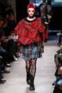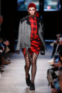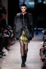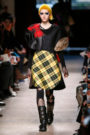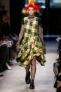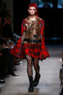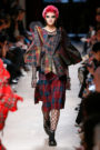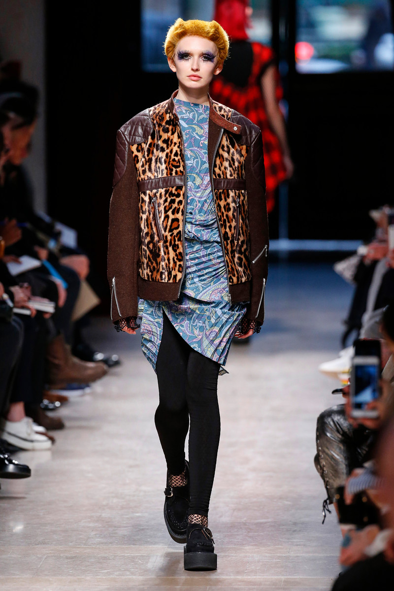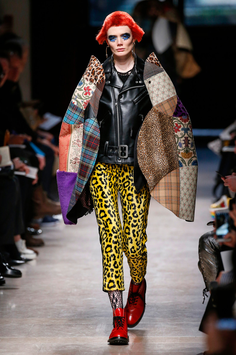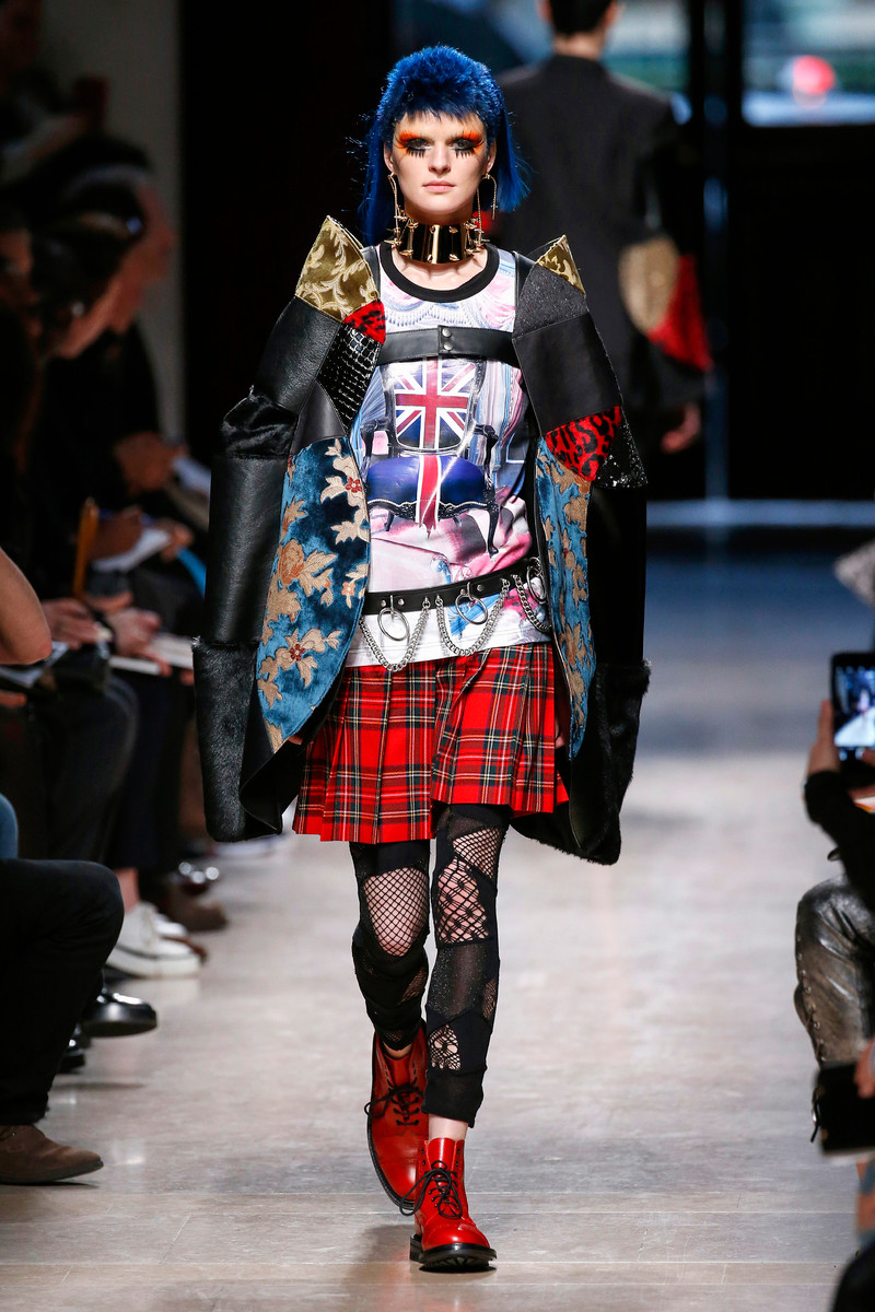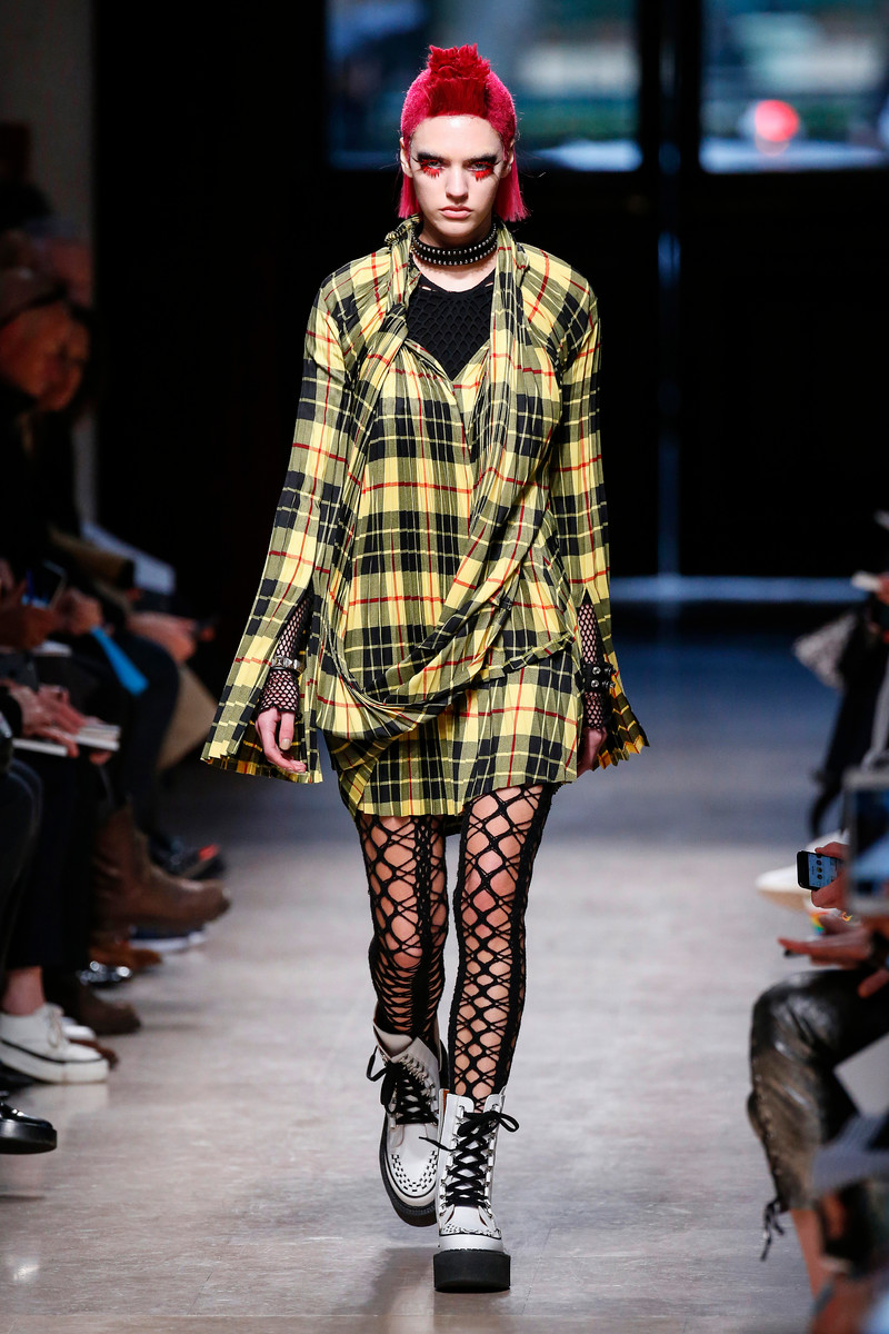 Junya Watanabe likes the ounk-era and this time het drew inspiration from the source: London. His punks were dressed in electric yellow and red plaids that were patchworked with black leather, sequins, traditional tailoring fabrics, a host of floral and jacquard upholstery plus leopard prints done the classic way. Everything was collaged: amorphorous capes and dresses crafted from circles and pointy triangles, some fused with motor jackets, many worn over pleated kilts and layered with fishnet sleeves and tights.