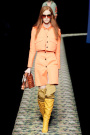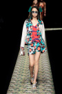 The setting of the show was a psychedelic projection of color and print, in front of which the models walked: in khaki safari suits and trench coats and dresses; in bustier tops and trousers with exotic prints; in off-the-shoulder dresses with a thick utility belt around the waist; in mint biker jackets; in parka jackets; and in those tiger jumpers. This time the tiger came disguised amongst a graphic crowd of lines. There were camouflage leopard prints in yellow and blue, and it came in orange and green later.