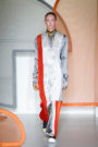 Liselore Frowijn designed her fall collection in the name of the greater goo: crafting an outdoor/nomadic/global collection as a commentary on “human unity and freedom.” The looks were pileups of quilted bombers, tunics and wide-leg pants that referenced traditional Indian garb, brushed wool scarves, ponchos and long tailored coats done in gradient colors. Planetary prints inspired by Alfred Eikelenboom and gold Spandex-ish layers added an otherworldly feeling to the eclectic mix.
