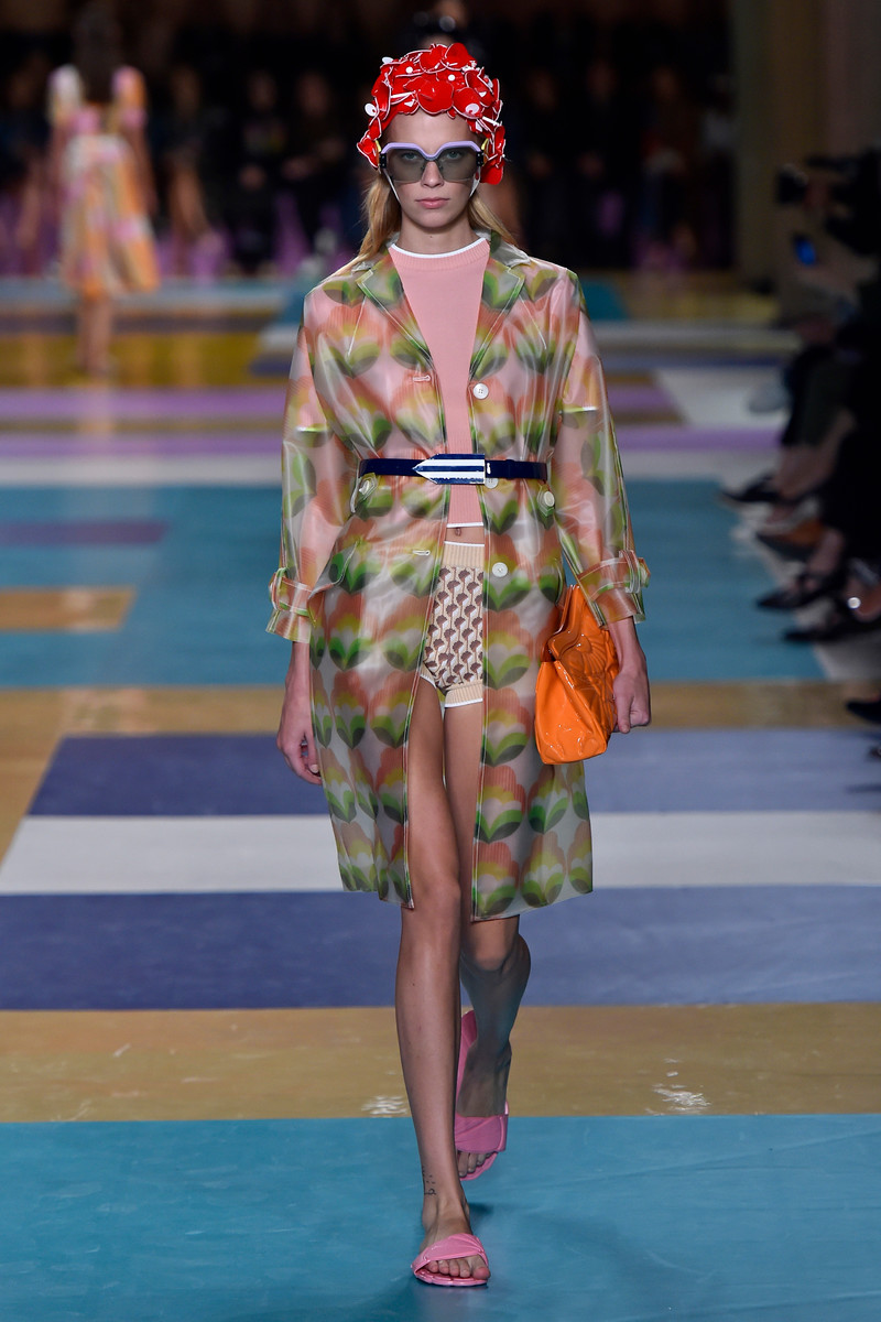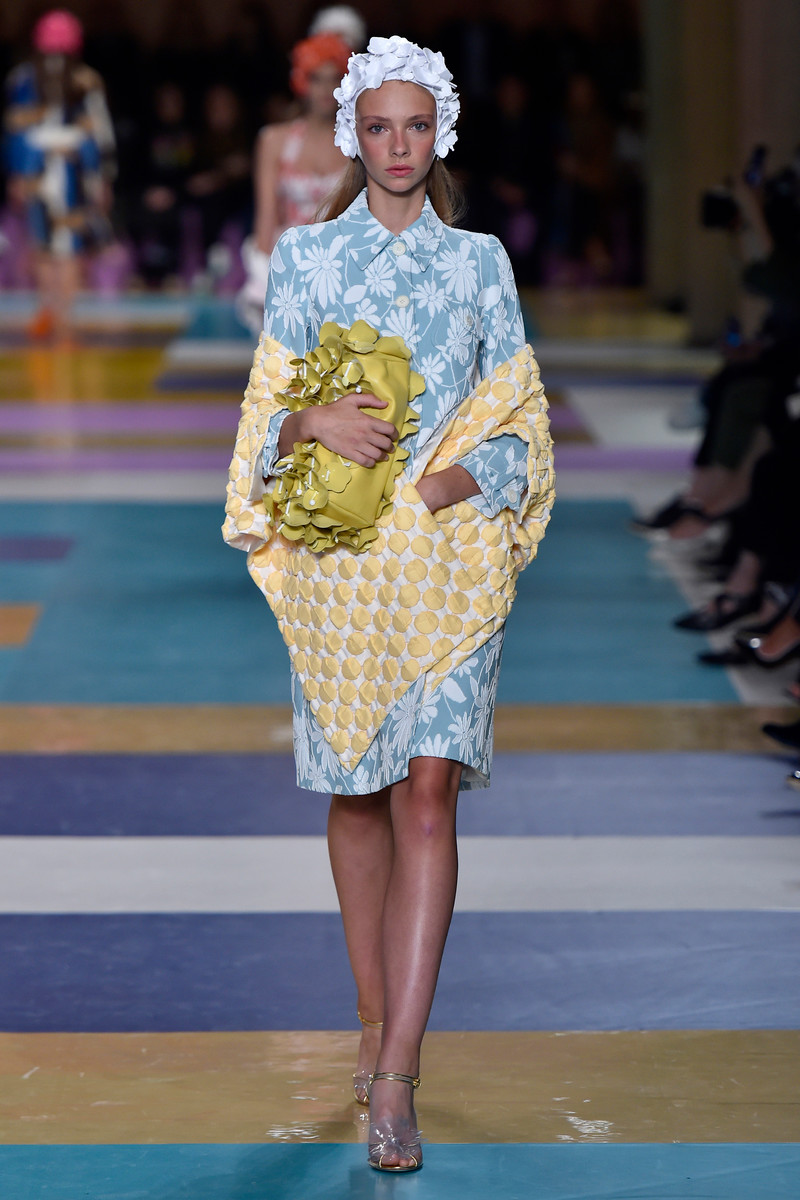 Oui oui, c’est fini. Miuccia Prada ended a fashion filled month on the happiest note. Sixties style complete with swimwear looks to rock a long summer in Portofino (or any other Italian city by the see). Bright colored, busy printed and fantasy full looks followed each other on the Miu Miu runway. As if those swim caps (and some matching bags) weren’t cheerful enough. Tea dresses were a theme as well as some of the robe-like fur coats in a multicolored palette, that seemed rather hot. Oh well, underneath them models were sporting high waisted bikini shorts, bodices with floral appliques and flip flops. Retro chic with just a touch of modernity. Something to look forward to while autumn has officially arrived and our winter coats can finally have their streetwear moment. Winter is coming, but a joyful summer is just around the corner.