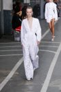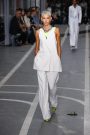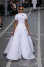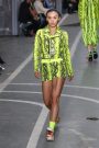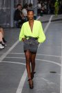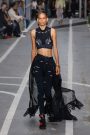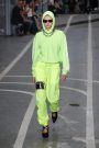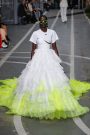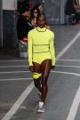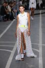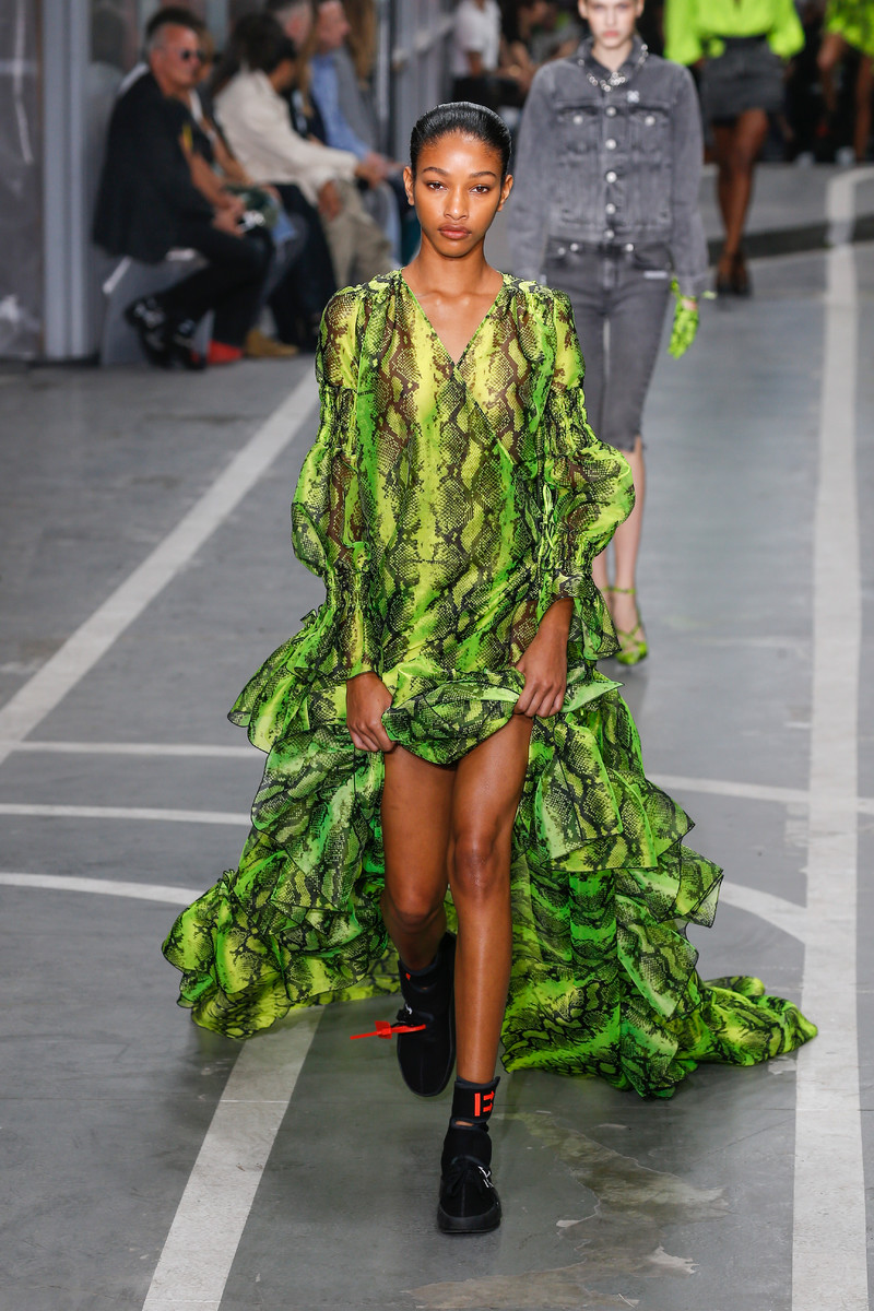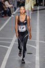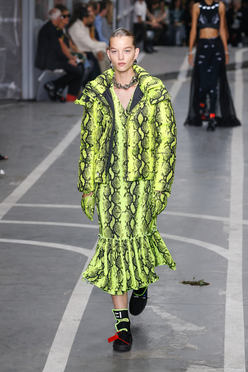 Sports & Chic came out in a pair of denim shorts and a velvet top and a pair of velvet pants with a denim jacket. In black sport leggings paired with a long lace skirt on top of it. In white sport leggings with a long floor sweeping gown over it. In a suit jacket that had “OFF” printed onto it in neon letters. A few looks were really just sporty as the finale of snake prints looks wasn’t necessarily sporty nor chic. It did make a bold statement.