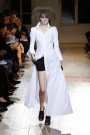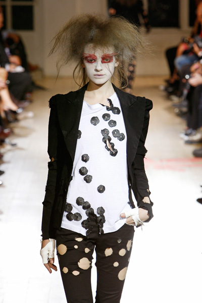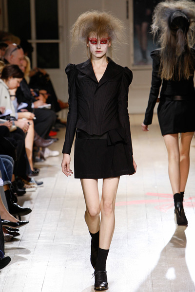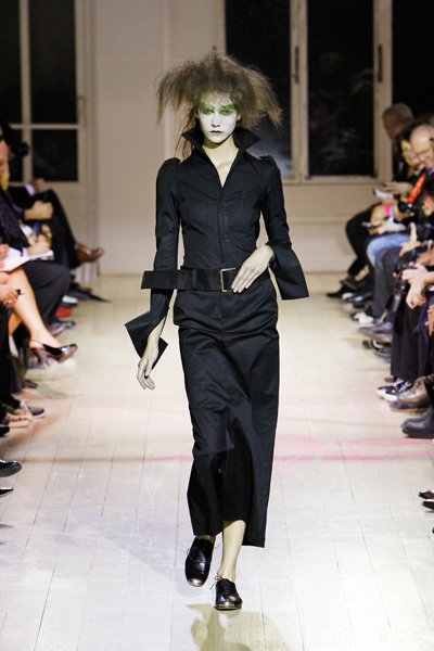 In his ss 2010 collection Yohji Yamamoto showed that there are endless variations on the black jacket. He designed a version which left the shoulders and a great part of the model’s breast uncovered. There were pointing and popped collars, zipped and unbuttoned jackets. One piece had circular cutouts, another extra long sleeves. There was a long tattered one and a trenchcoat version. Two leather examples were shown. Unfortunately the jackets were much of the same. Therefore your attention was sometimes pulled more to the hair and the make-up of the models, which looked horrific. The hair was back combed and sprayed white. The faces were white and had a square of colored eyeshadow around the eyes. Towards the end there were some designs in white with floral prints. Nice repetitive details were peaked shoulders and wide collars. Overall Yamamoto showed a safe and wearable collection. (Tess van Daelen)