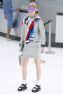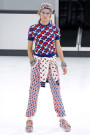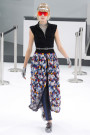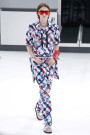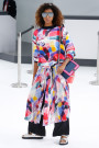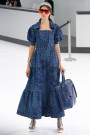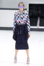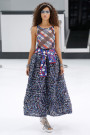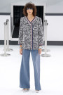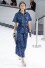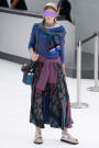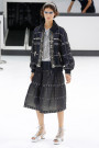 Colorful (with lots of blues, reds and whites) and busy printed, so it turns out. With not just the typical tweed skirt suit in all it’s variations – a Chanel design classic that never goes old – but theme inspired departure board prints and plane patterns too. Long skirts were paired with pants as shorter co-ords seemed quite risqué for any regular flight personnel. But then again this is Chanel’s world and here everything is possible. Like the fantasy printed sweater and skirt worn by Imaan Hammam or a denim on denim flared skirt and jacket with puffy sleeves that popped up in a series of denim looks towards the end of the show.