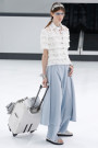 Anything and everything was airport themed. From the Chanel hard-case wheelie carry-on bags to the sandals with implemented runway lights around the soles. As the models sported either shiny mirrored sunglasses or blue make-up where sunglasses (sleeping masks perhaps?) should be. Those chunky chains, pearl necklaces and statement cuffs might take a while a security, but who would mind spending some extra time at this luxurious Chanel Airport?