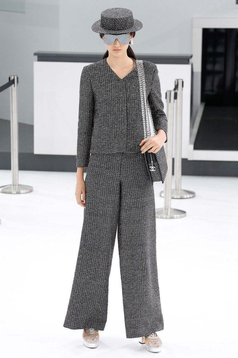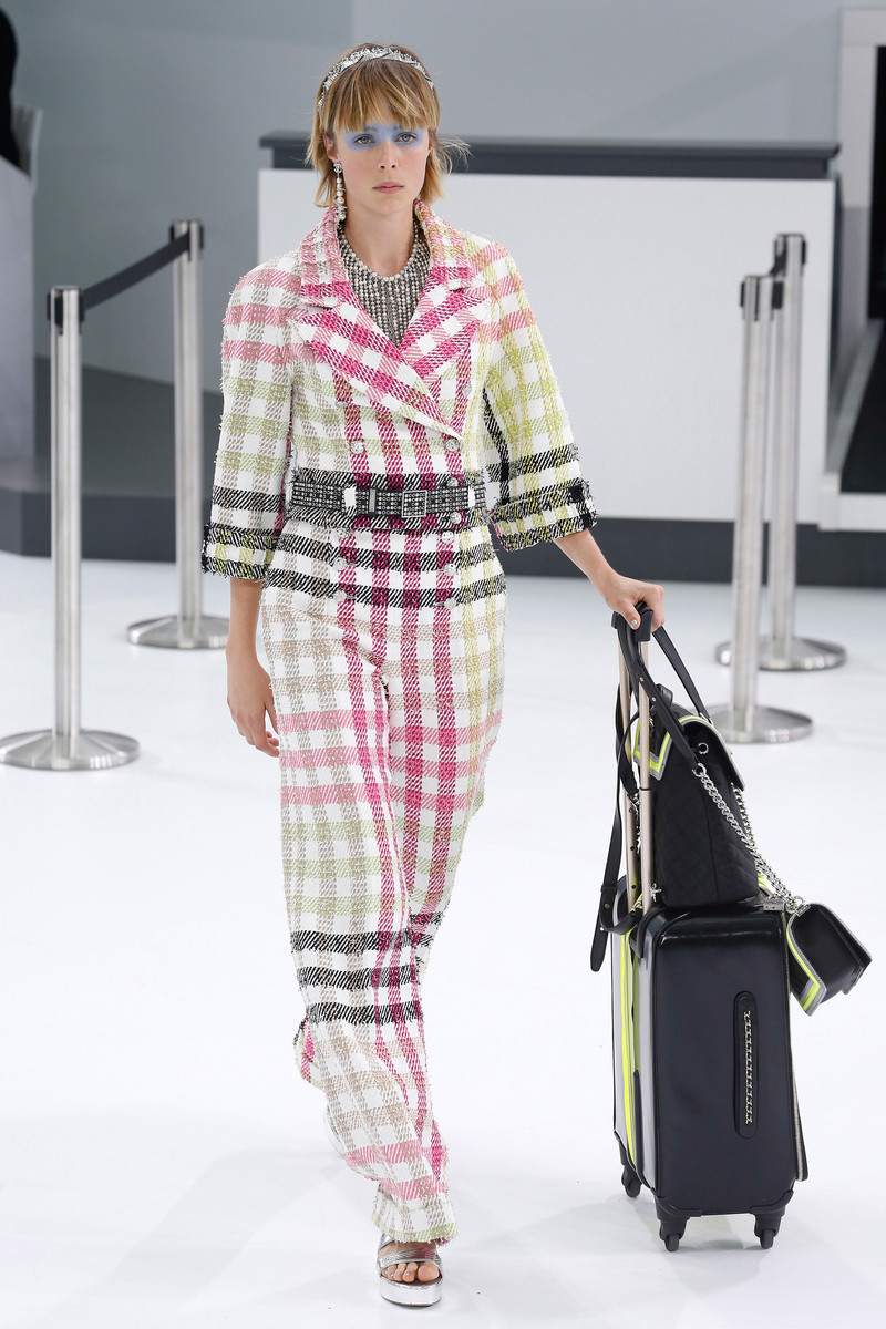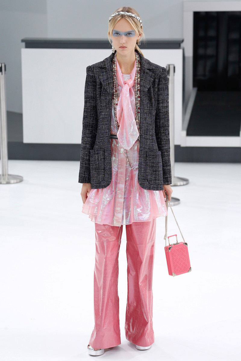 Anything and everything was airport themed. From the Chanel hard-case wheelie carry-on bags to the sandals with implemented runway lights around the soles. As the models sported either shiny mirrored sunglasses or blue make-up where sunglasses (sleeping masks perhaps?) should be. Those chunky chains, pearl necklaces and statement cuffs might take a while a security, but who would mind spending some extra time at this luxurious Chanel Airport?
