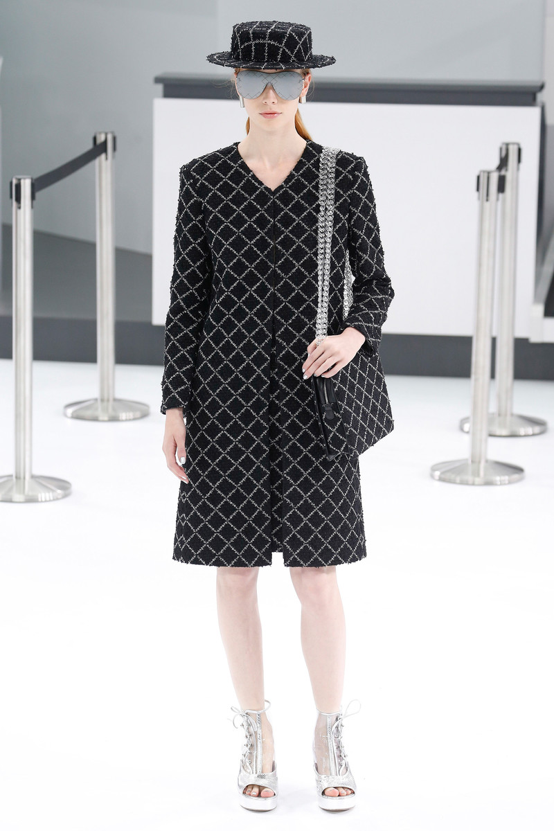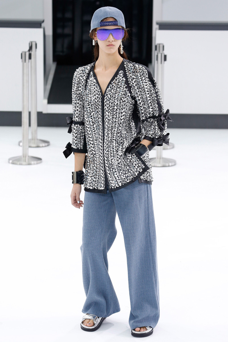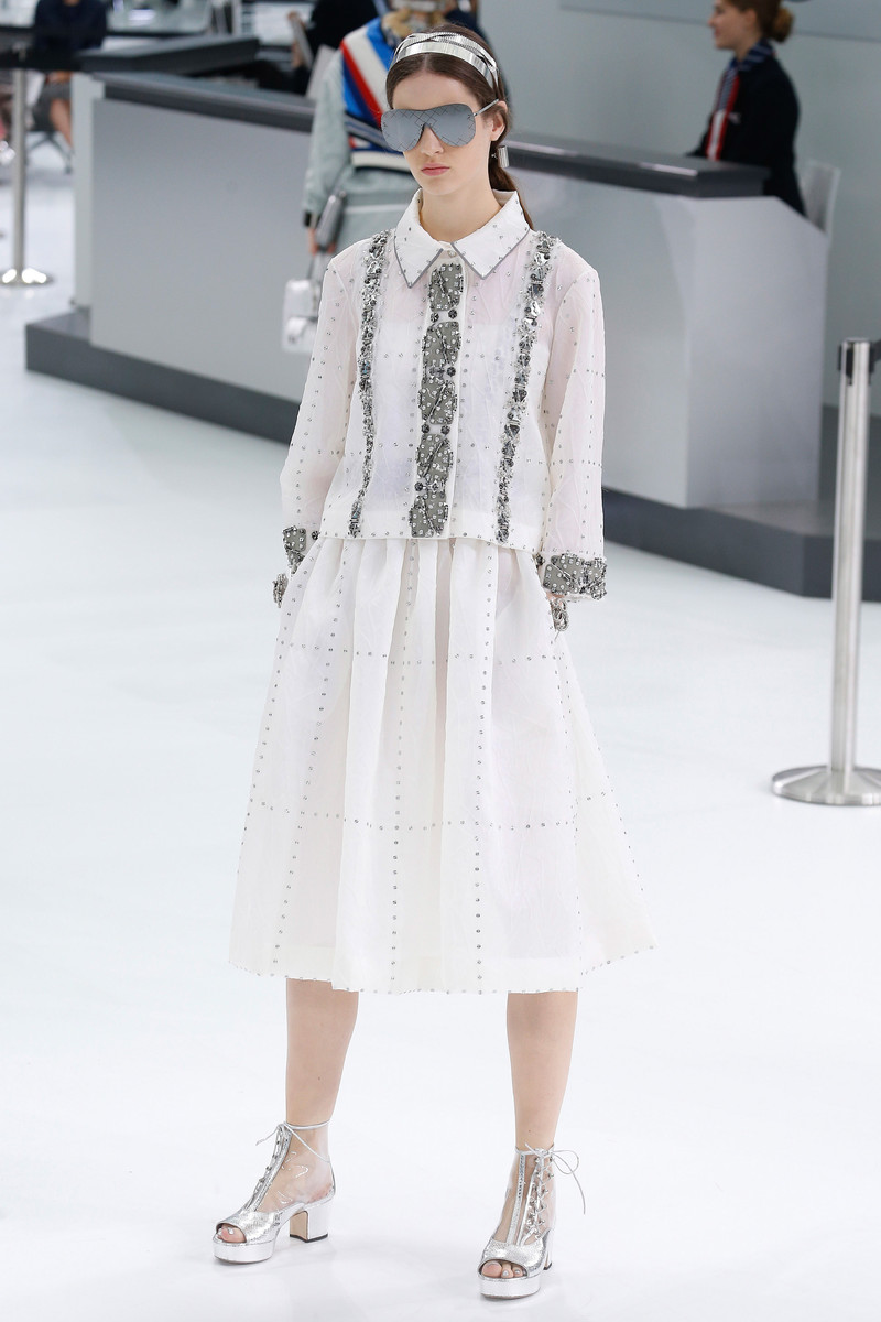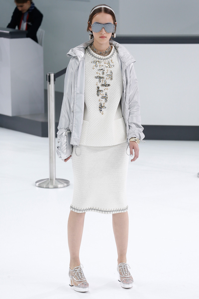 Anything and everything was airport themed. From the Chanel hard-case wheelie carry-on bags to the sandals with implemented runway lights around the soles. As the models sported either shiny mirrored sunglasses or blue make-up where sunglasses (sleeping masks perhaps?) should be. Those chunky chains, pearl necklaces and statement cuffs might take a while a security, but who would mind spending some extra time at this luxurious Chanel Airport?