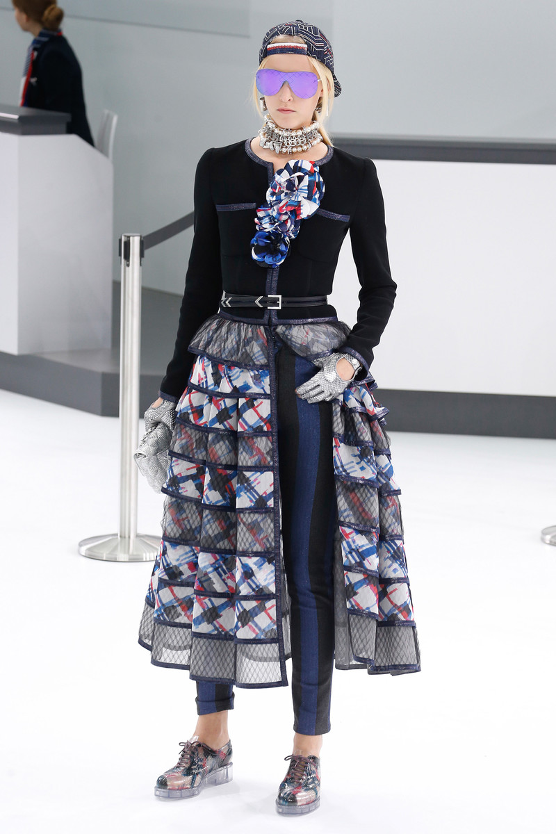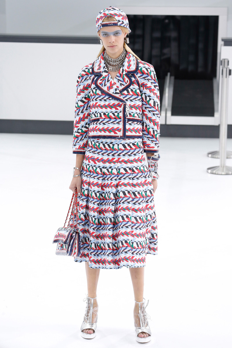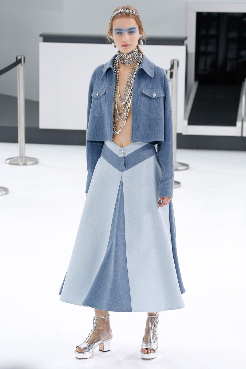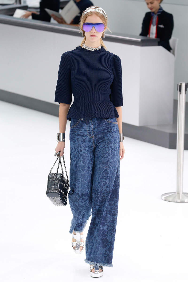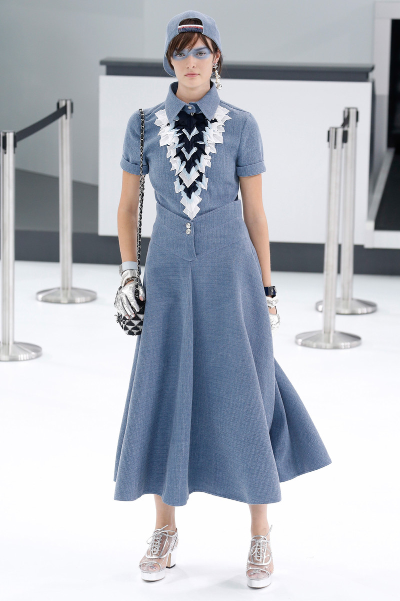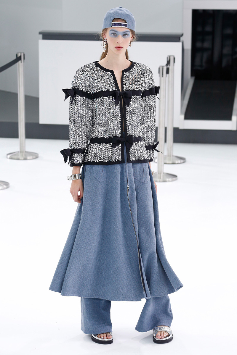Colorful (with lots of blues, reds and whites) and busy printed, so it turns out. With not just the typical tweed skirt suit in all it’s variations – a Chanel design classic that never goes old – but theme inspired departure board prints and plane patterns too. Long skirts were paired with pants as shorter co-ords seemed quite risqué for any regular flight personnel. But then again this is Chanel’s world and here everything is possible. Like the fantasy printed sweater and skirt worn by Imaan Hammam or a denim on denim flared skirt and jacket with puffy sleeves that popped up in a series of denim looks towards the end of the show.
