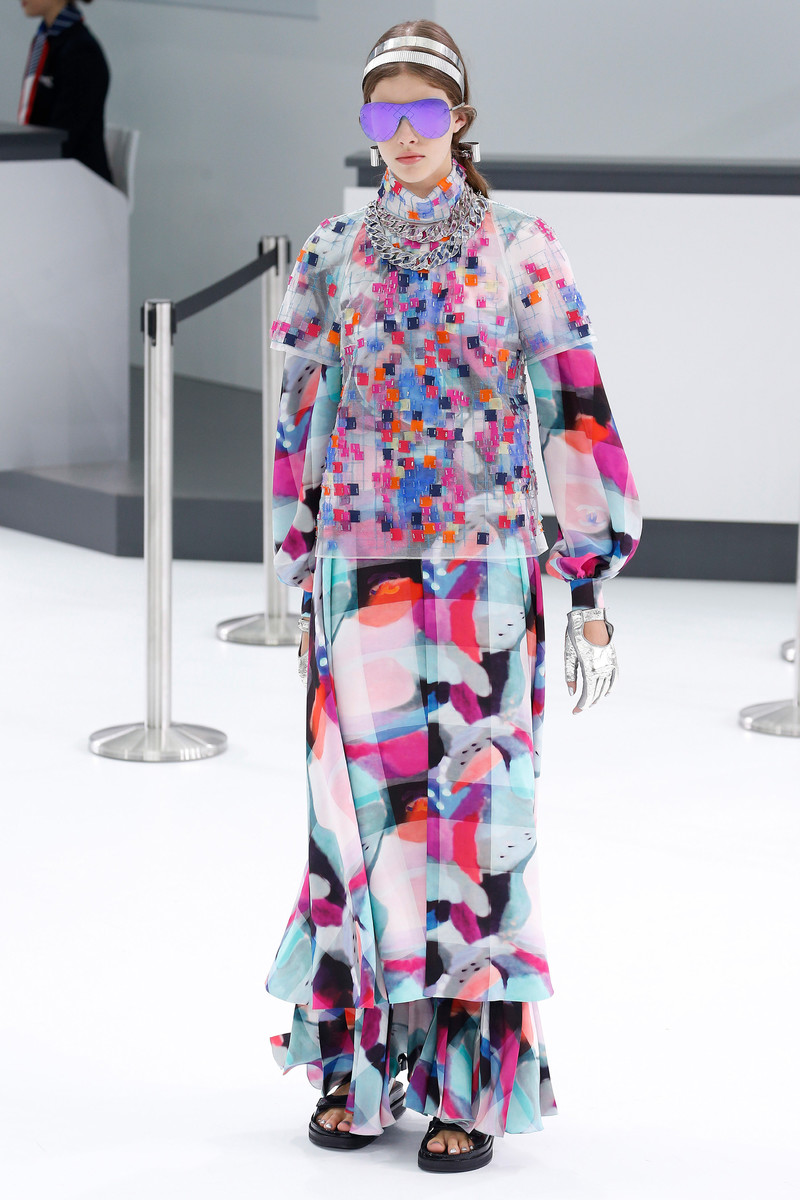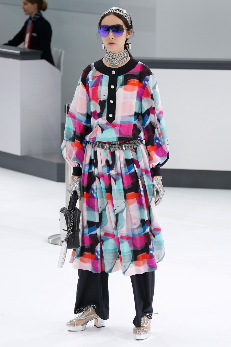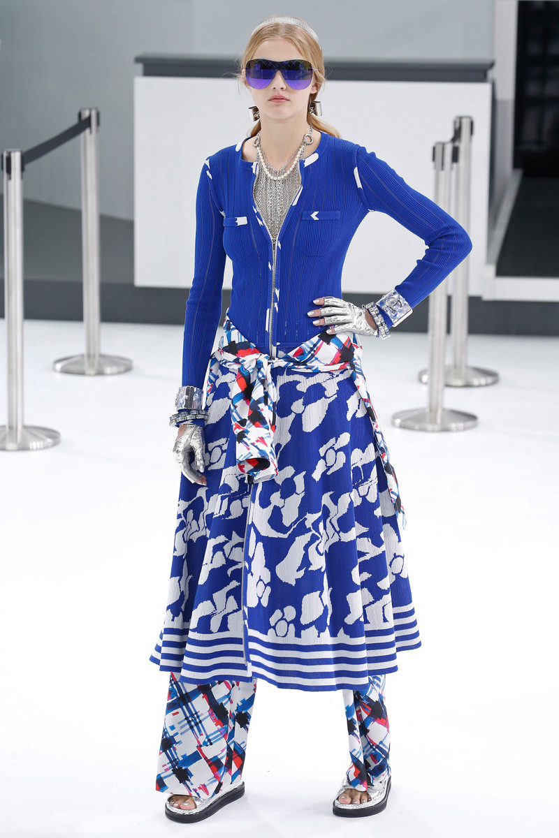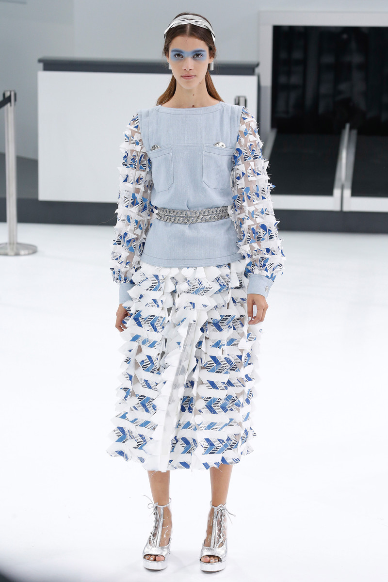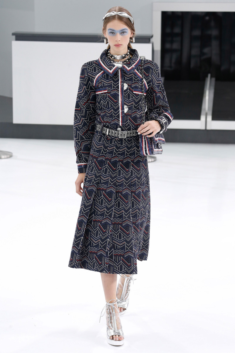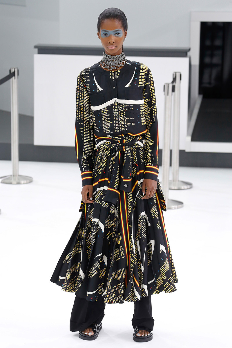 Colorful (with lots of blues, reds and whites) and busy printed, so it turns out. With not just the typical tweed skirt suit in all it’s variations – a Chanel design classic that never goes old – but theme inspired departure board prints and plane patterns too. Long skirts were paired with pants as shorter co-ords seemed quite risqué for any regular flight personnel. But then again this is Chanel’s world and here everything is possible. Like the fantasy printed sweater and skirt worn by Imaan Hammam or a denim on denim flared skirt and jacket with puffy sleeves that popped up in a series of denim looks towards the end of the show.