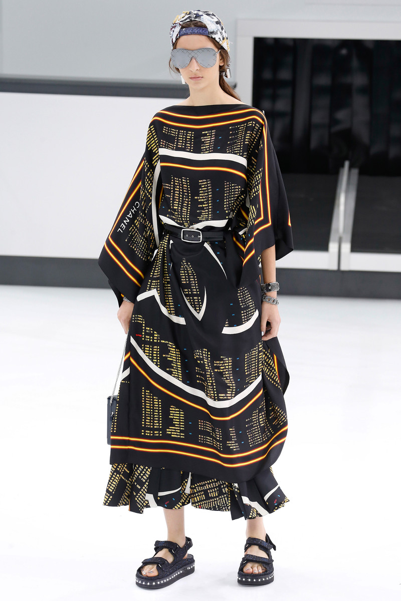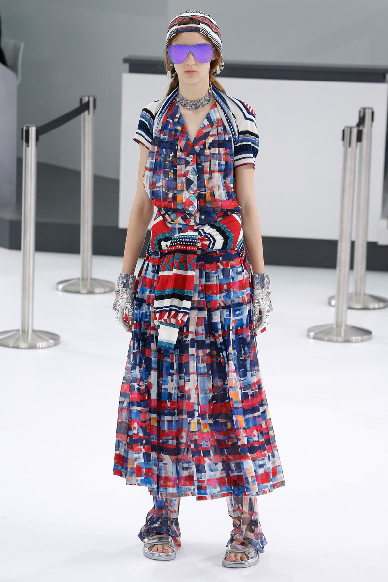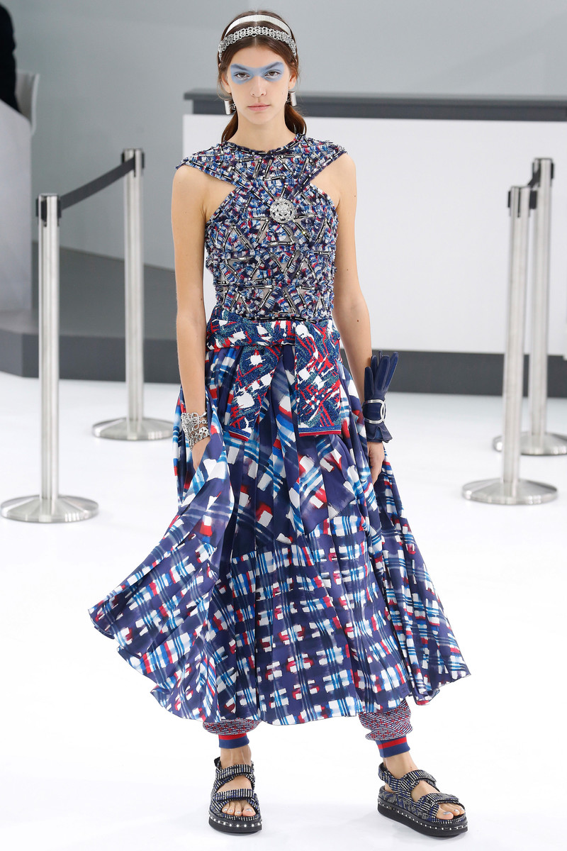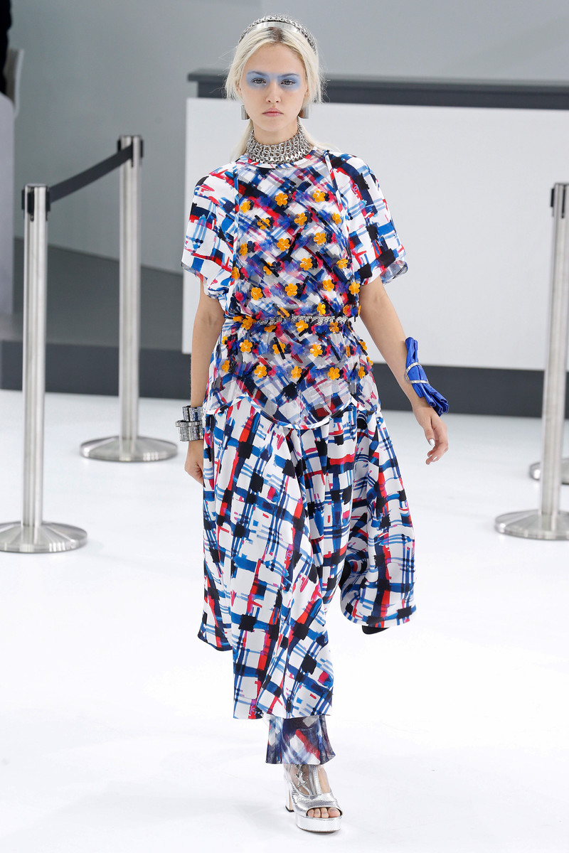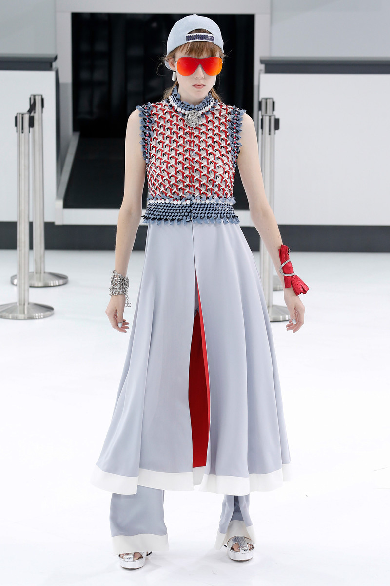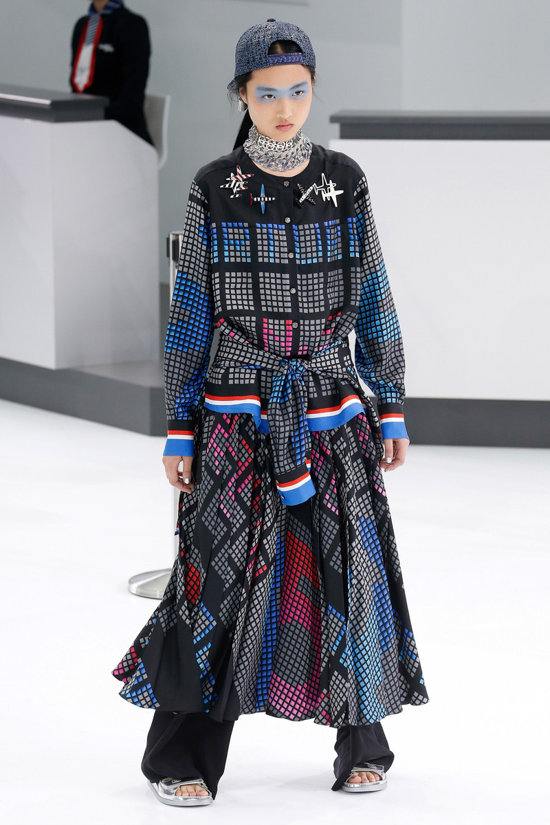 Colorful (with lots of blues, reds and whites) and busy printed, so it turns out. With not just the typical tweed skirt suit in all it’s variations – a Chanel design classic that never goes old – but theme inspired departure board prints and plane patterns too. Long skirts were paired with pants as shorter co-ords seemed quite risqué for any regular flight personnel. But then again this is Chanel’s world and here everything is possible. Like the fantasy printed sweater and skirt worn by Imaan Hammam or a denim on denim flared skirt and jacket with puffy sleeves that popped up in a series of denim looks towards the end of the show.