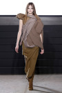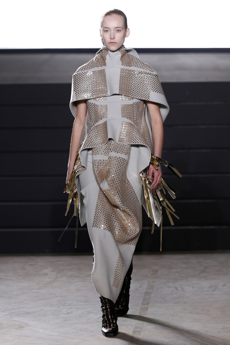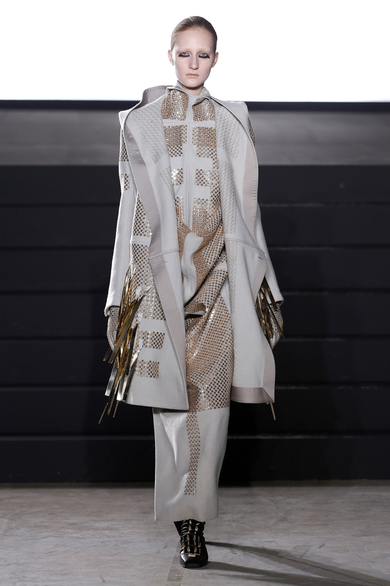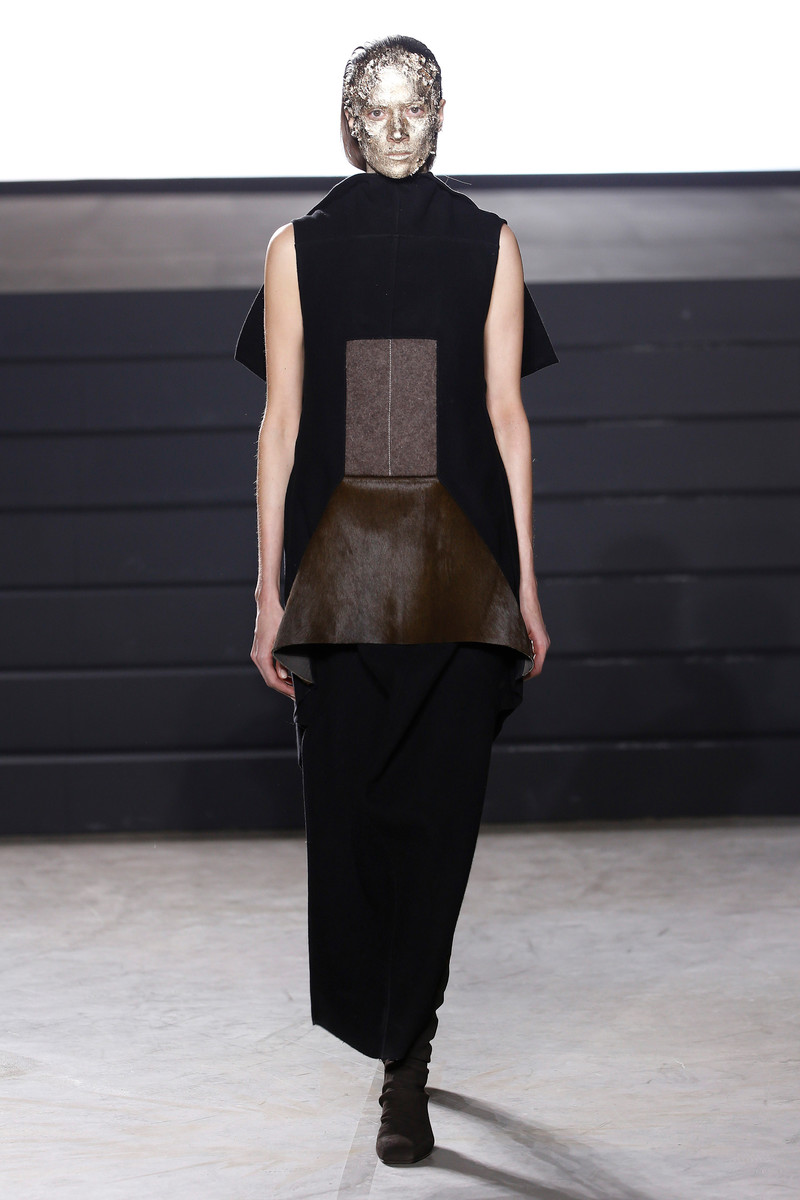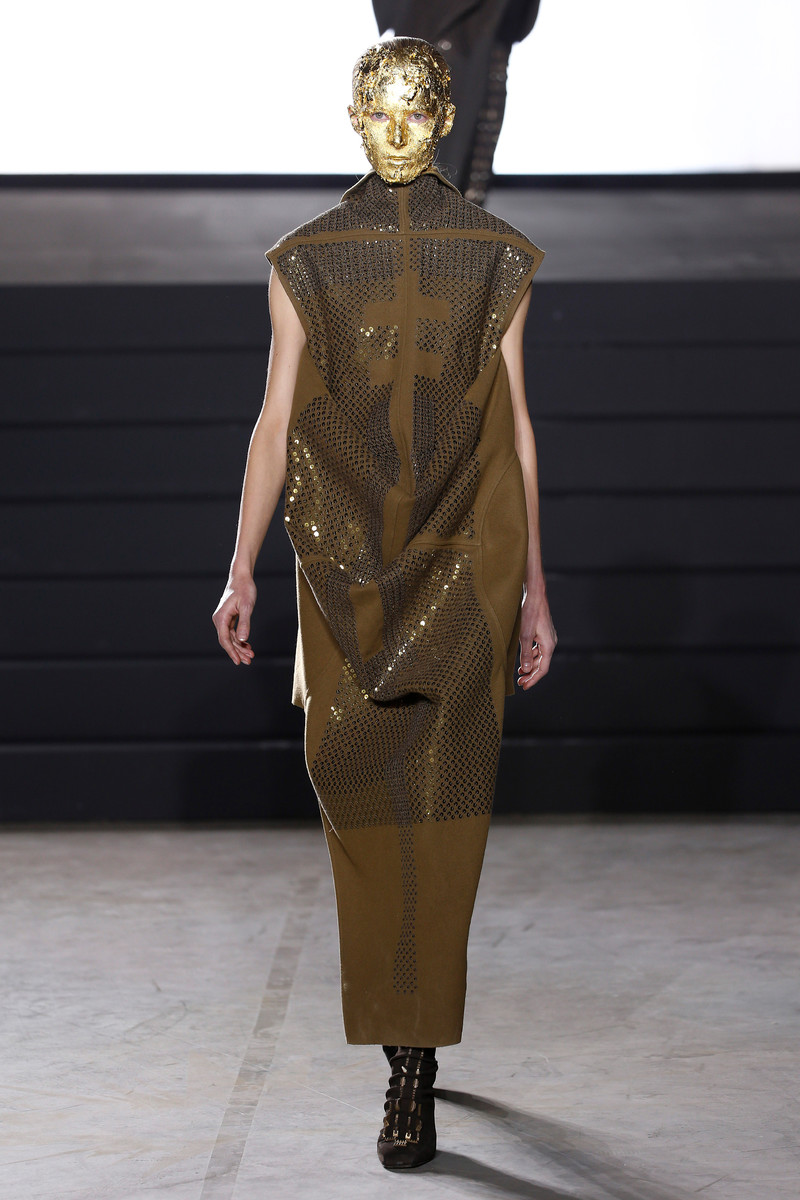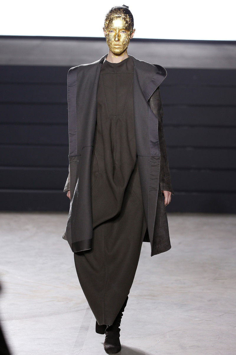 Luckily Rick Owens´ menswear shocker was no longer talk of the town today. And luckily the designer didn´t pull that stunt again during his womenswear presentation. No instead he gave some of his models gold and silver foiled faces. Metallic masks to match his structured collection that combined glam with Owens signature rawness. Sober shades, but there was more enough excitement to observe. Sequins, fringes and glitter in the mix with heavy winter fabrics like suede, fur and the thickest wool. Techniques of draping and layering made every look appear like outerwear even when bare arms were revealed. Quilted coats, 7/8 skirts, woolen tunics and asymmetric overcoats, that definitely deserved a closer look, seemed futuristic. Not one to set trends or appeal to a mass market Rick Owens created absolute stand out pieces. Pieces that, when styled differently, can be the conspicuous pieces of our everyday wardrobe. Saving those masks for extra special occasions.