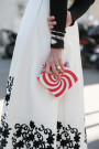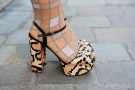 For fall, Raf Simons wanted to explore the more sexual side of the Dior-woman by taking her natural urges out of the garden, to a place where more primal instincts dominate: the animal world. The show’s sexual content proved more discreet than Simons’ idea would suggest. The show opened with a pair of short black cutaway dresses with colorful facings and pointy metal mesh collars. Both were worn with second-skin Lucite-heel boots in a blown-up, blue-and-red animal pattern. Such abstracted skin motifs would prove a recurring theme, two or three thick, wavy stripes undulating across a coat or making a splash on a swingy minidress, and, several times, on flashy bodysuits. Often they formed the underpinnings for an impressive lineup of coats.