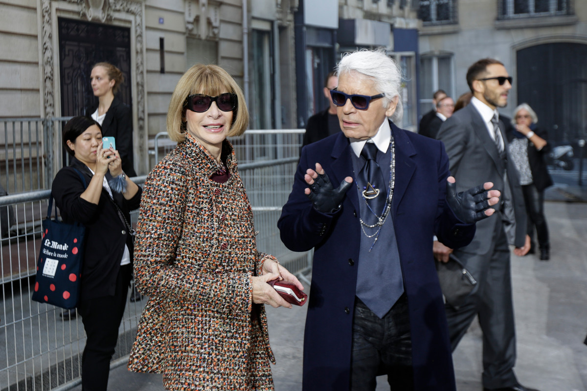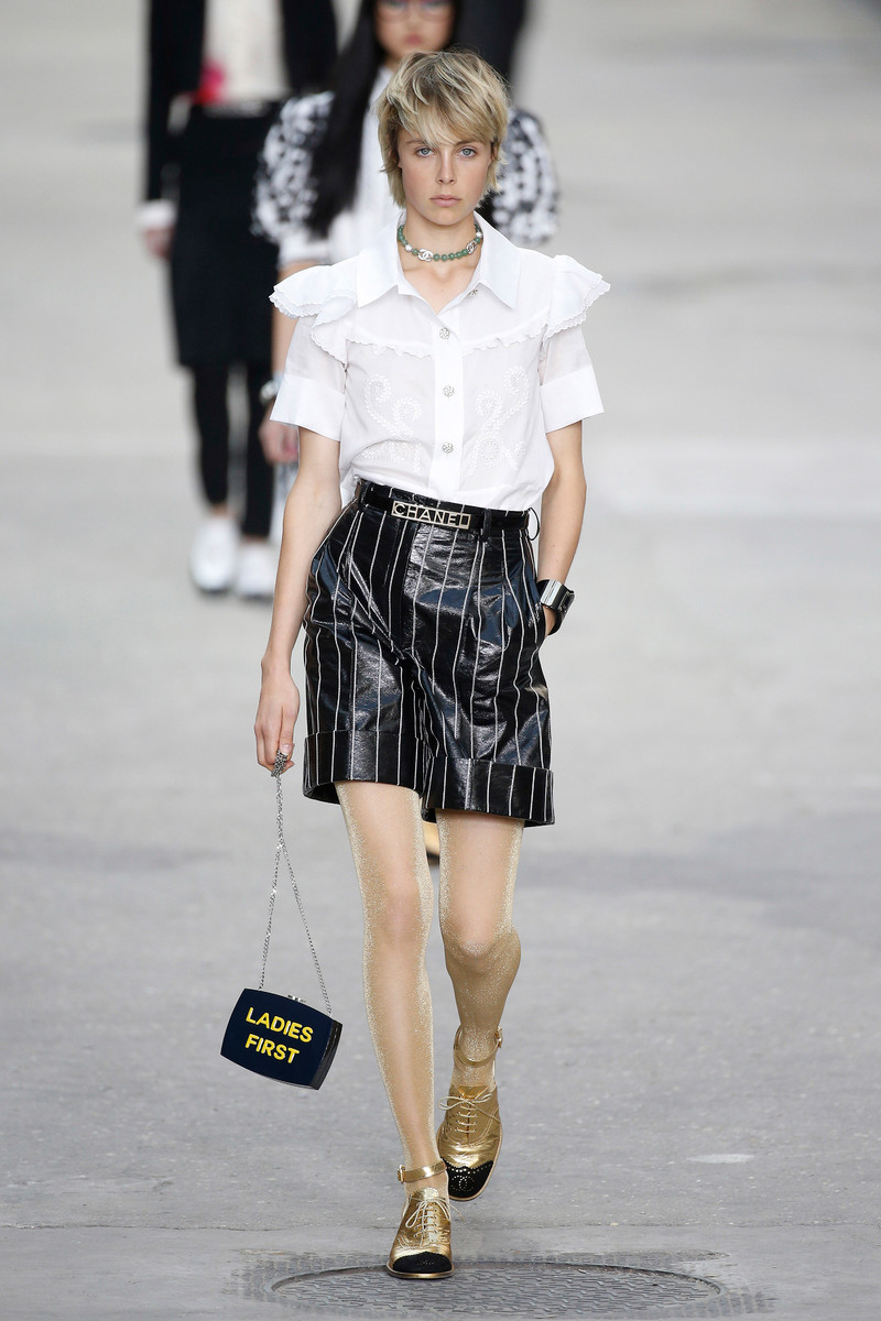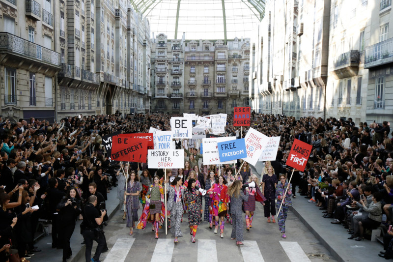 The streets of Paris formed the backdrop of Chanel’s extravagant fashion show this morning. No, Karl didn’t present his designs outside, he build his own Boulevard Chanel No.5 inside the Grand Palais. And that boulevard turned out to be a perfect fit with the streetwise clothing the designer presented. Some of his favourite stars and it models of the moment like Edie Campbell, Gigi Hadid, Cara Delevingne and even Gisele (no last name needed) made their appearance strutting Karl’s optimistic collection. It involved full on tweed suits (for summer!), bright floral printed coats and matching boots, party dresses with metallic details, pinstripe ensembles and a wide range of white Victorian blouses. Socks were golden, as were sandals and belts. From punk rock to Saint Tropez chic; there were enough style variations to fashionably get you through any type of occasion. To stress the liberate feeling of the collection the finale involved a protest, led by Cara Delevingne holding a megaphone. Followed by all models carrying sings like ‘Tweed is better than tweet’, ‘Be your own stylist’ and ‘History is her story.’ Quotes not by far as strong as Karl’s own oneliners, but they added to the cheerful vibe of the show.