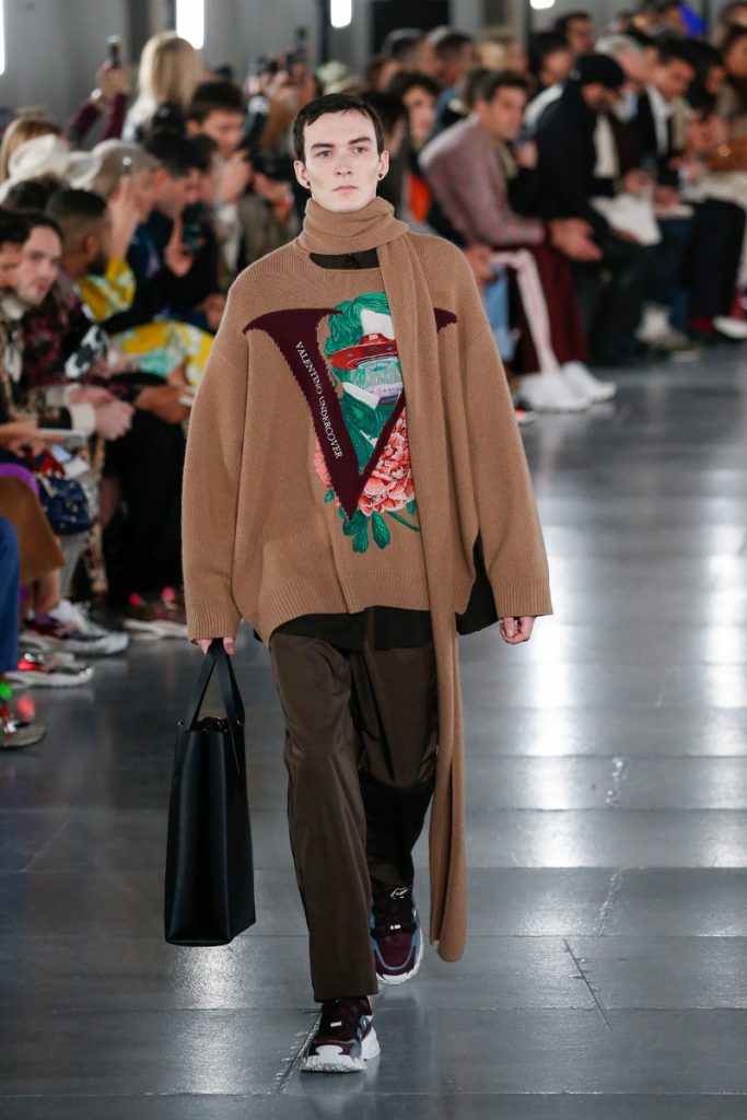 Pierpaolo Piccioli set up some collaborations for fw2019. First he joined forces with Jun Takahashi of Undercover. Together they created a series of prints (with time traveler slogans, spaceships, skulls, and a joint VU – for Valentino – Undercover logo) that would appear in both of their menswear collections. In tailoring, like many fashion houses this week, Piccioli moved away from the sportswear and into a more relaxed way of dressing. He said he’d been looking at the fluidity of Italian tailoring in the 1980s. And so he designed easy going suits, comfy woolen coats, the softest sweaters and jackets with the feel of a hoodie. All worn with perfect pleated pants and either sneakers or Birkenstocks, the second collaboration for this collection. And all of a sudden patent red Birks worn with black socks seemed like a pretty good footwear option to wear on a warm October day.