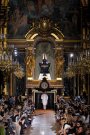 Tisci’s catholic backround turned up in the priest collars on his sixties shifts, in the voluminous bishop sleeves on a striking black jacke, in the split skirts worn with crisp, dry blazers and pants, like church vestments.