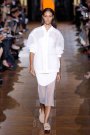 Stella McCartney seemed in a happy mood regarding her ss2013 collection in vibrant whites, oranges and shots of green – and some black. The colors were incorporated into an inventive lineup. In a season where sheer fabrics and layers are seen everywhere, McCartney added layering pants — see-through pajamas under cropped trousers or long, crisp eyelets over snappy shorts. She also used structured organza for an warm-up jacket and sweatshirt. And McCartney combined sweatshirts over a dress in a key motif, superlean ribbed knits featuring big, bright ellipses on sheer plissé. On the tailored side, low-belted jackets and tuxedo-inspired day dresses looked simple and smart.