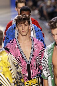 Think American tourists playing golf in the 50s. A touch of Hawaii and American retro with a fun dose of bad taste. Tailored, double-breasted suits mismatch with loud clashing floral printed shirts or pants. Western shirts embellished with rhinestones, recall memories of young Elvis. Prada and Kenzo spice up there ranges with funky, colourful accessories