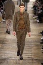 For next fall Junya Watanabe showed us a different take on the Fair Isle knits, which were a big hit this winter. Instead of showing the print on cardigans and sweaters Watanabe used it on suit jackets and coats in the most colorful examples. They looked comfy and warm and formed a good combination with the ankle hem of the (pretty basic-looking) pants. As they ambled around some park benches, placed in the middle of the stage, Watanabe’s mustached models really worked the new look.