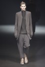 Rick Owens continued to search the depths of the dark side with a fall-winter 2010 menswear collection of gender-bending, space age-y designs ready for the apocalypse. Androgynous models with enviable cheekbones skulked down the catwalk in bulky, tie-waisted trenches in lacquered microfiber or wrinkly microfiber with stiff, standup necklines and drop-crotched harem pants. Some wore ribbed turtlenecks with knee-length flaps in the front and back, while others sported leather tank tops that left their backs bare.