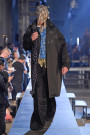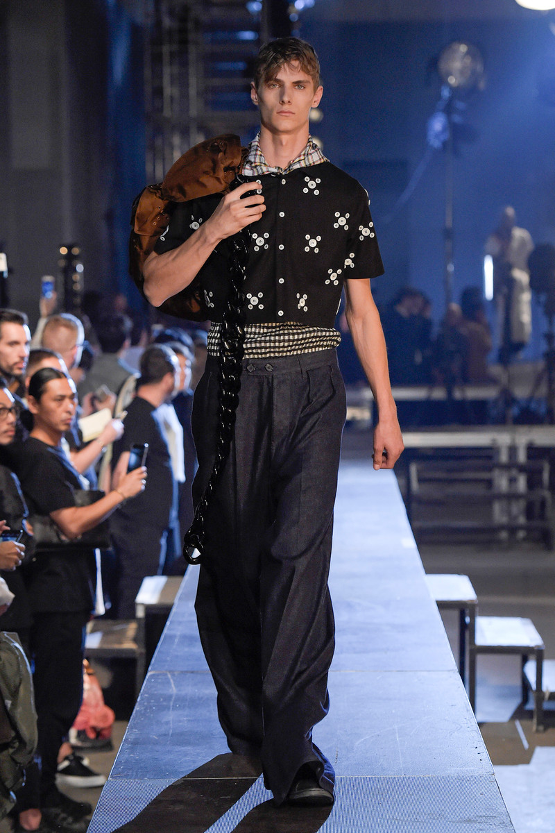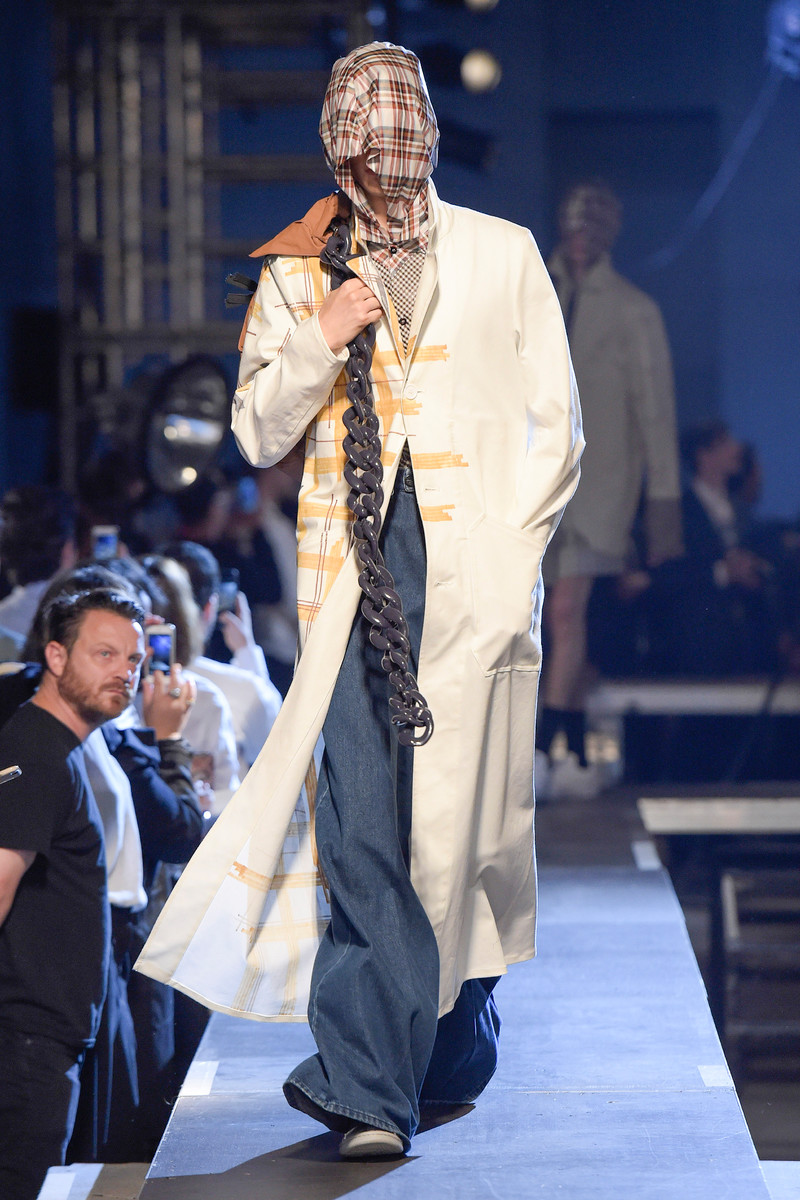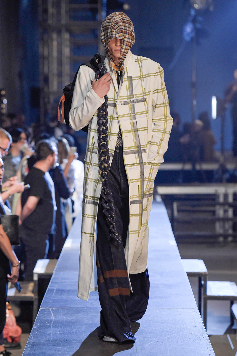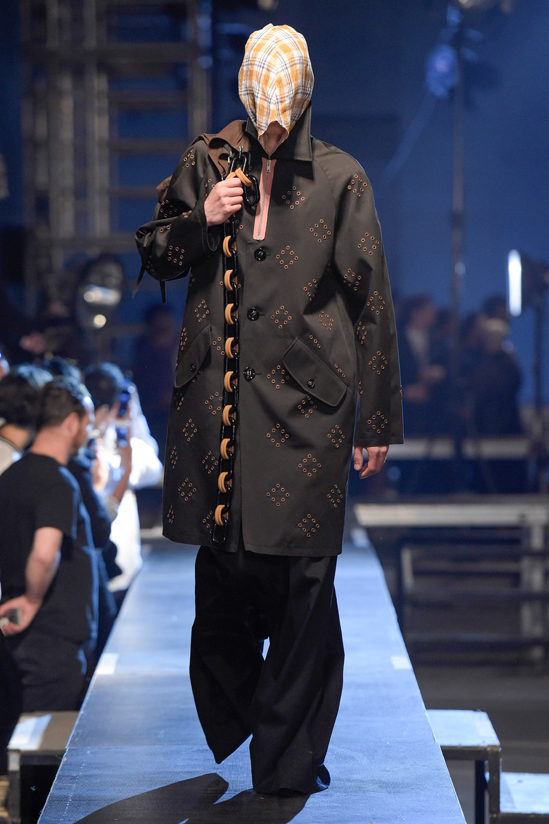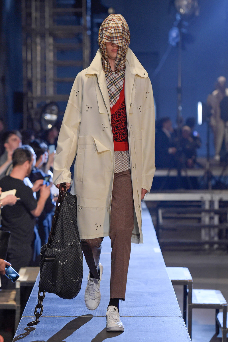 The flared black trouser legs puddled around the feet. The models’ heads were cloaked in checkered scarves, obstructing their view. The space glowed red and the rave music rumbled. Raf Simons still knows how to set a mood of youthful rebellion, and the electricity of a fashion happening. There was certainly a punk spirit to his oversize macs riddled with grommets in geometric formations. Edgy too were his oversize grommet-studded nylon rucksacks, which models lugged on heavy chains draped over one shoulder, dragging around their belongings like a burden.