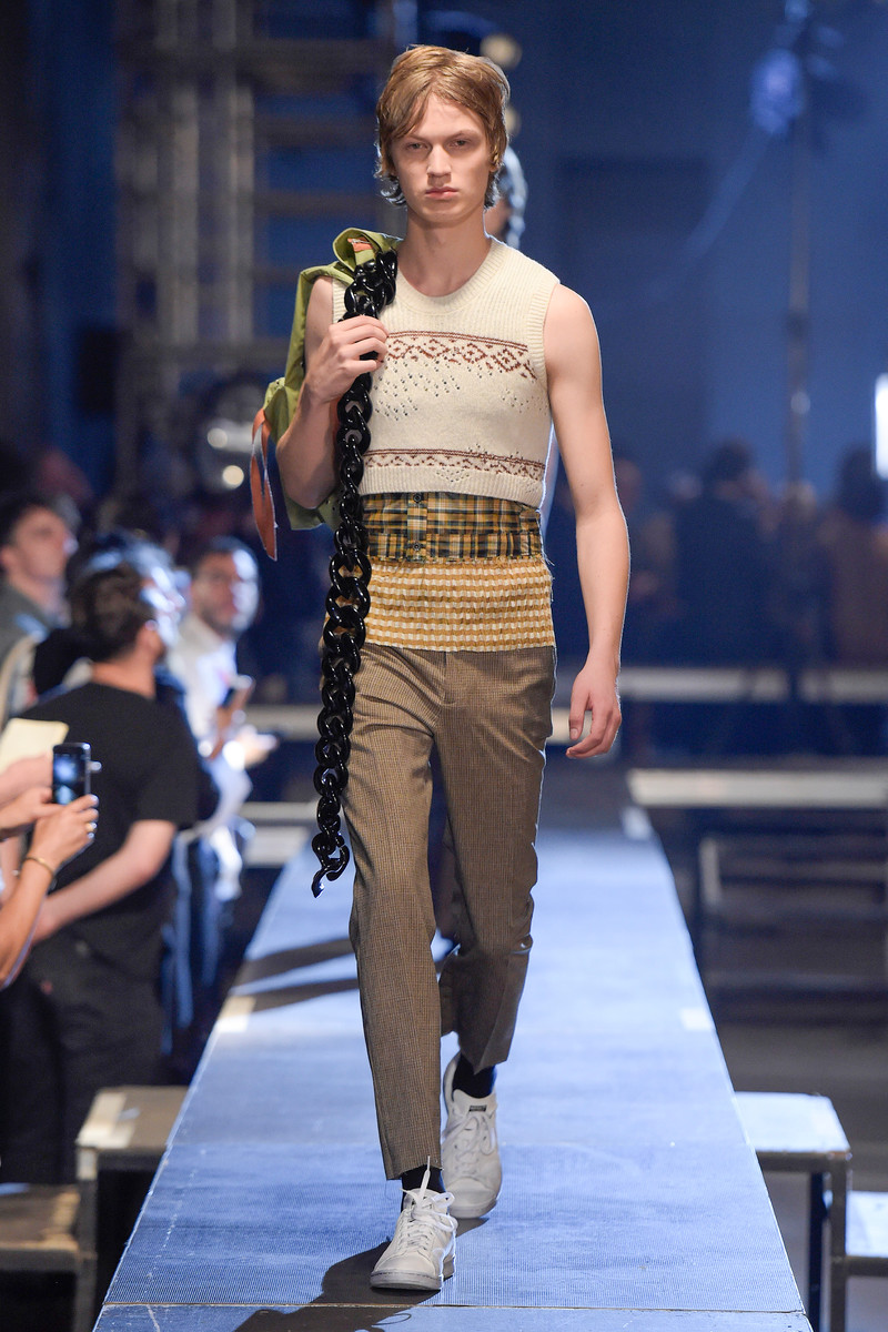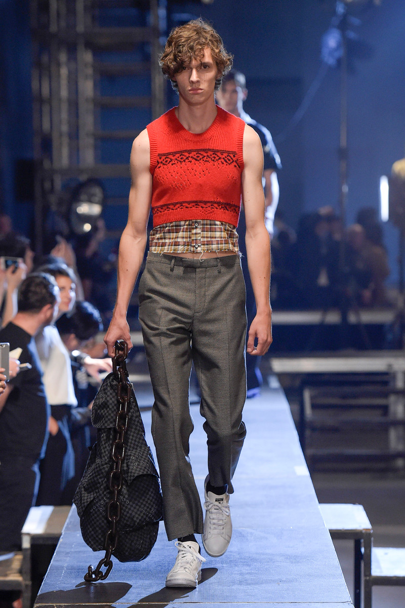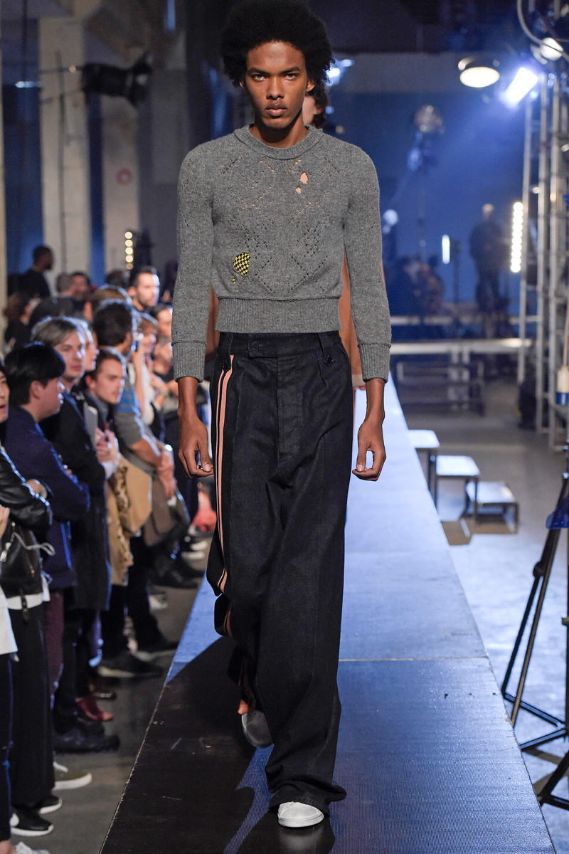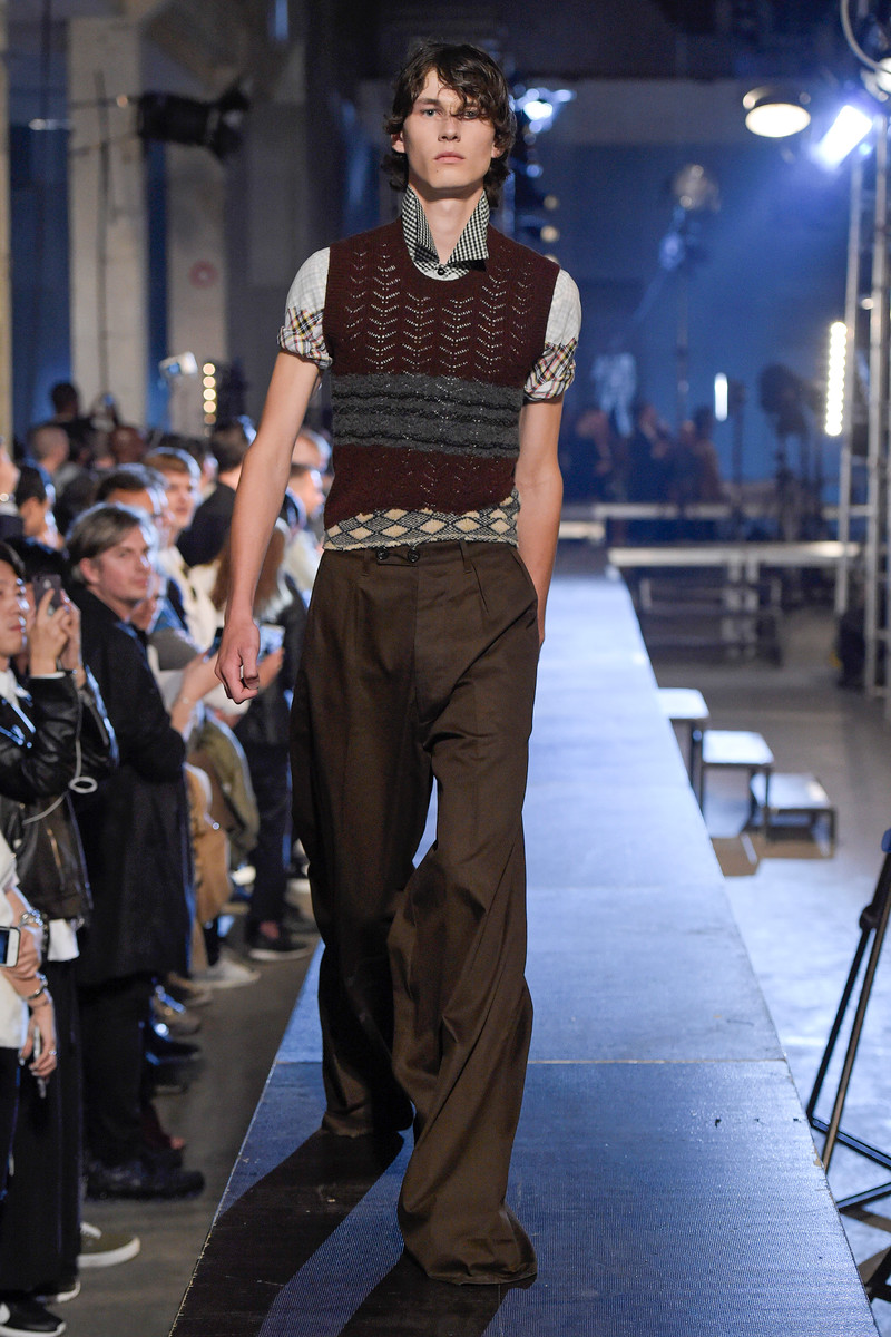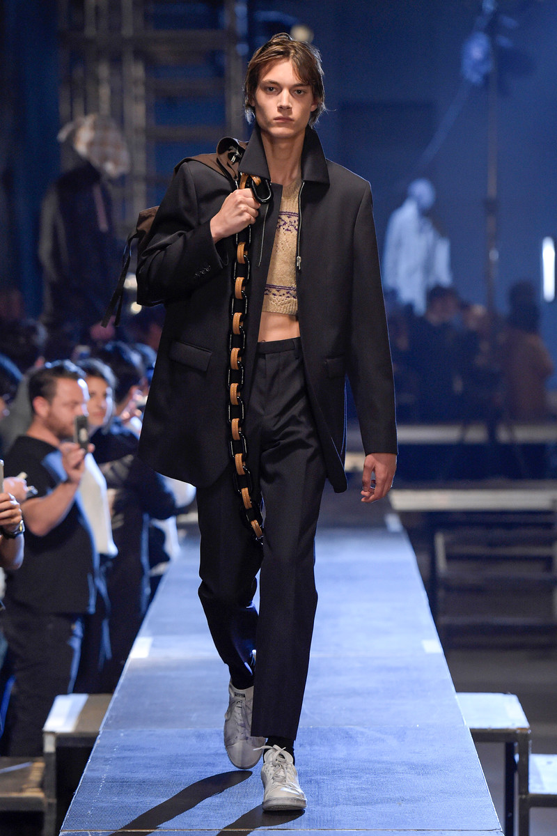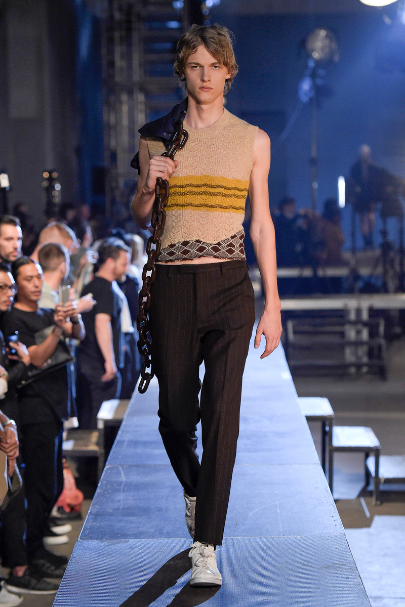 The rest of the collection felt more familiar, as Simons continued to experiment with the narrow, elongated shapes he introduced for fall. There was his shrunken Seventies sweater vests, which helped exaggerate the oversized pants. Tailored jackets were either lean or gently oversized in sturdy woolens.