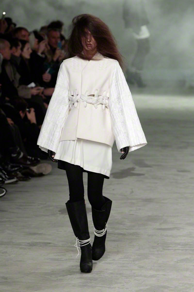 Owens chose a heavy theme for his fall/winter show. Battle-scarred heroism was the inspiration for his signature big coat, boots and T-shirt and a full range of black and white creations. His pale models with the frizziest hardo’s could be seen sporting kimonos, asymmetric tunics and coats with larger than life stitches (which were in fact created by traditional basket-weaving techniques). Large gloves, high standing collars and a few fur details accessorized the looks. Like so many designers Rick Owens opted for a Japanese influenced collection. Yet he managed to use this popular theme in a very unique way, inspired by his notion of heroic grace under pressure.