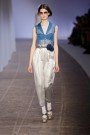 Marco Zanini presented his second collection for Rochas on the runway. He added more color and print to a collection that was built on slip dressing, tailoring, and knits. His starting point seemed a French woman in the colonies. He translated that in shades of aubergine, paprika, saffron, lemon, turquoise, and mint. Belts and flowers (also in prints), sandals and ankle socks were his favorite accessories. The collection focused at slipdresses, sheer, sleeveless blouses (with retro bra), cropped trousers or short knit dresses with a flaring ice-skater skirt.