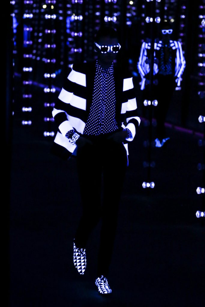 There was a first and a second half to the Saint Laurent show. One in daylight, one neon/glow in the dark. The first half spoke of all the signature Saint Laurent ingredients; ultra short dresses, strong (this time XX strong) shoulders, bodices and tuxedo jackets. Most looks came in grey or black, there were just touches of red, leopard print and polke dot tights to top it off. Velvet, leather, silk and fur in the mix. Anthony Vaccarello knows what the Saint Laurent customer wants and how to spice things up every season, the strong shouldered coats being his main upgrade for fw2019. As far as the neon part of the show’s concerned; this was more of a fun and colourful pop parade to watch. We could hardly see the looks let alone the models wearing them. Can’t say we wouldn’t like a night out in an off shoulder fur striped neon dress though..