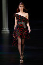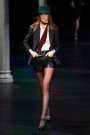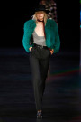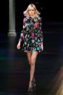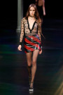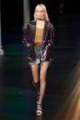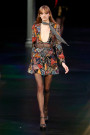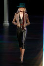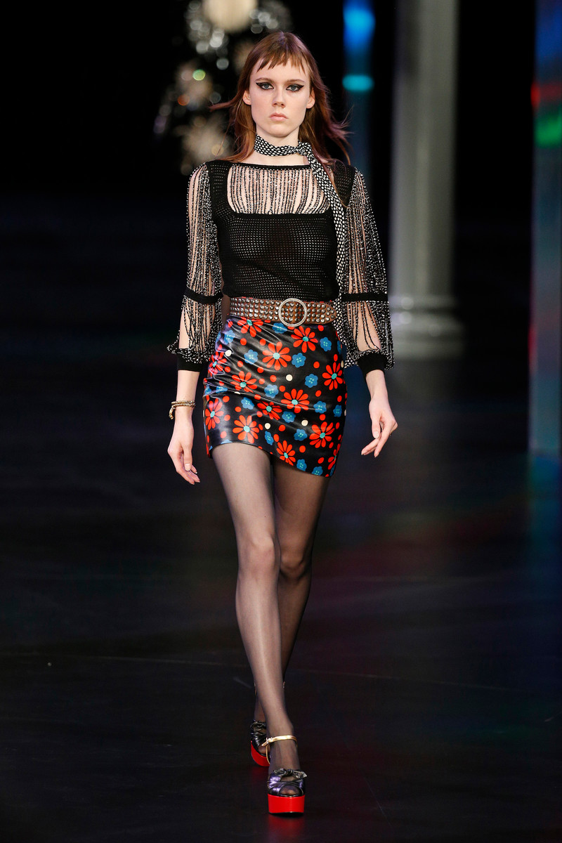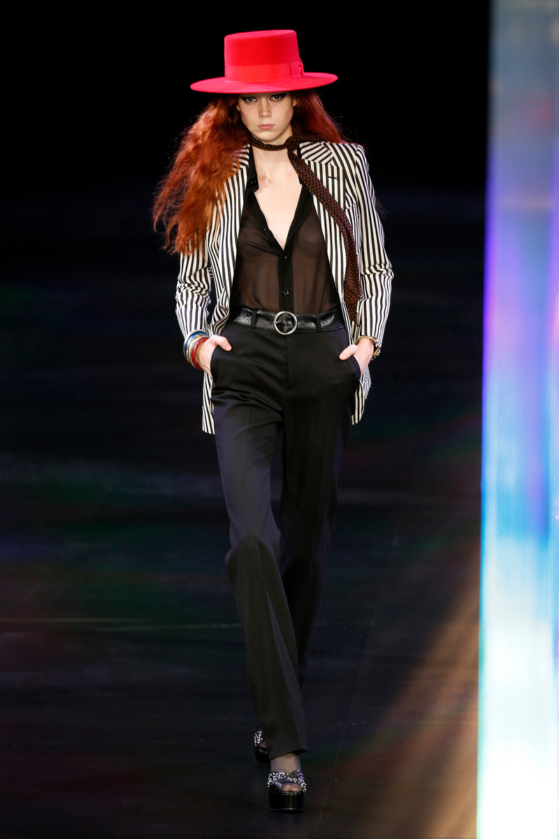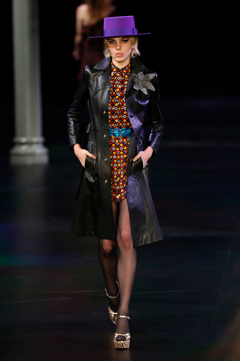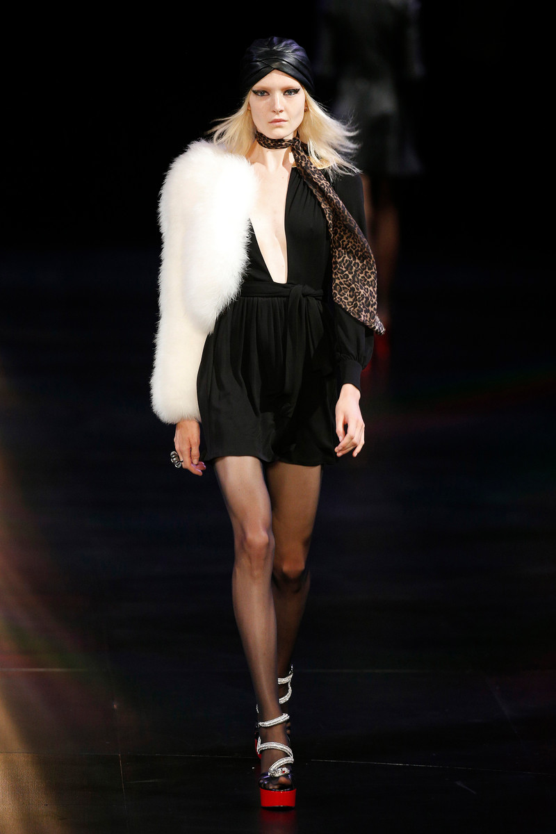 A lot of cleavage, skirts high up and “Un, deux, trois, coucher avec toi” through the speakers; Saint Laurent was one raunchy fashion spectacle. Yet with the right amount of fashion and coolness to attract youngsters all around the globe. Looks had a careless, mismatched appeal. Army jackets, biker jackets, fur coats and velvet suit jackets being tossed on just about any skimpy party look. Same goes for the hats, turbans, flowers and scarfs in contrasting color palettes, adding to the nonchalance yet eclectic vibe of the show. A vibe that somehow made the classic YSL turn into the hottest hipster brand in town a few seasons ago, although Slimane introduced a bit more color and print for SS2015. A seventies, L.A. kind of vibe that is so very in fashion nowadays and will make women line up for those leather skirts, floral dresses and the lowest tanktops.