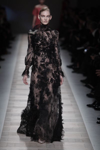 Five long evening gowns were the ending of the show. The last one in transparent Valentino red looked stunning. Yet a black lace gown with a butterfly on the right shoulder, worn by Patricia van der Vliet, was even more breath-taking.
