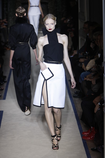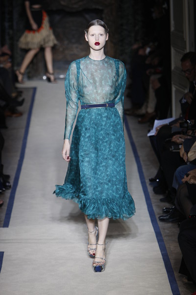 The looks were classical and feminine and often showed some skin. Like the backless jumpsuit, the sheer turquoise printed dress and the chic black dress with cutouts and a low V-neck Freja Beha wore.