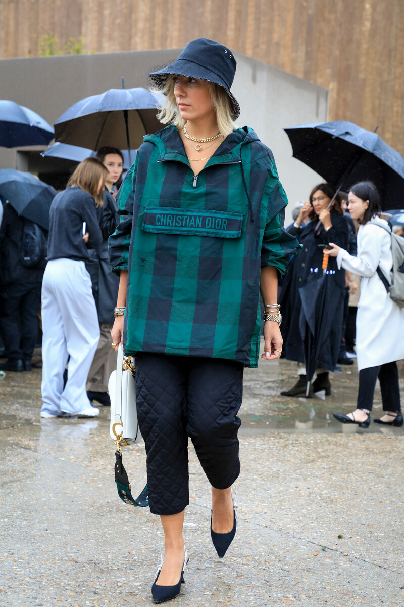Come rain, come shine, keep it cool in some Buffalo plaids and a Dior bucket hat. (Last week, outside the Dior show)