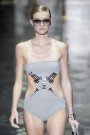 We saw the strangest cutouts in diverse places. Above the armpit (Gucci, Kane), diagonally over the breast (Emporio Armani), around the stomach (Gaultier, Armani), above the breasts (Balmain, Gaultier, Elie Saab), under the breasts (Ungaro), between the breasts (Gucci), around the navel (Girbaud, Pucci, Alexander Wang), on the upperarms (Gucci), on the upper legs (Michael Kors, Viktor & Rolf) and around the waist (Erin Wasson, Laroche, McCartney).