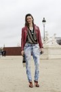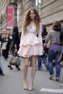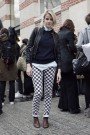 Milla Jovovich ones again showed the popularity of the navy trend. Anna dello Russo worked a splendid (Balmain) jacket with silver embellishments (as seen at Anna Sui). And one of the girls we spotted on the street, showed she had guts with a pair of checked pants (which might just be inspired by the Watanabe show that was full of the black and white checked print).