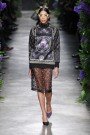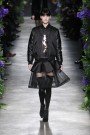 The clothes however were rather classic and feminine: pencil skirts, blazers and buttoned-up shirts done in shiny black silk, leather and velvet. It was the way they were presented plus the panther that gave it all a kinky edge. A variation on the strong silhouette were the sheer, narrow skirts worn under ruffled minis. Often the look was finished with a black fur or leather baseball jacket. Beautiful, feminine pieces were the blouses done in pink embroidery and a cropped sweater in fluffy yellow mohair.