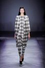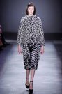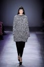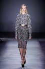 For next winter Giambattista Valli presented quite a sober collection. He showed knit dresses, checked coats, knee length skirts and sleeveless tops all with one and the same focus point; a wide belt around the models’ waists. Perhaps the designs were a little less sexy than in a average Valli collection, but it definitely fit right in with today’s trends. Looks were cosy and appeared perfect for a cold winter day. Yet some of these looks can be deceiving since some of the knits were actually trompe l’oeil effect printed on airy fabrics. Still, no matter what choice of fabric all outfits were perfectly balanced. Tops looked as great with fur-ish skirts as they did with transparent pleated ones. Some full on graphical printed (and colored) looks (Marni-ish) and a golden croc leather coot stayed classy. And the sheer evening gowns which ended the show mixed covered sexiness with sophistication in a unique way. Now that is how you present a wearable cohesive collection.