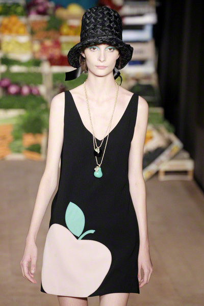 After Prada’s banana’s last spring and the pine-apples of Stella McCartney, the team of Dolce & Gabbana invited us to the Italian kitchen. They offered us eggplants, courgettes, hot peppers and onions in beautiful dresses, sexy baby-dolls and funny accessories. The stage of Moschino Cheap ‘n Chic was a fruit-market, and the collection was inspired by apples and strawberries. At least it adds color and fun to the clothes and from now on we look with a different eye to a simple Italian tablecloth 😉
